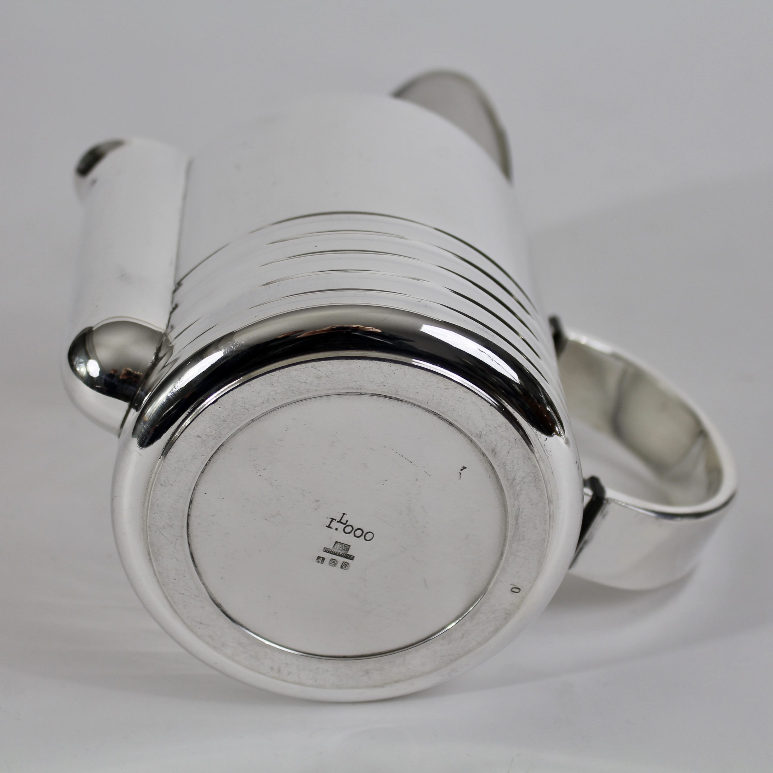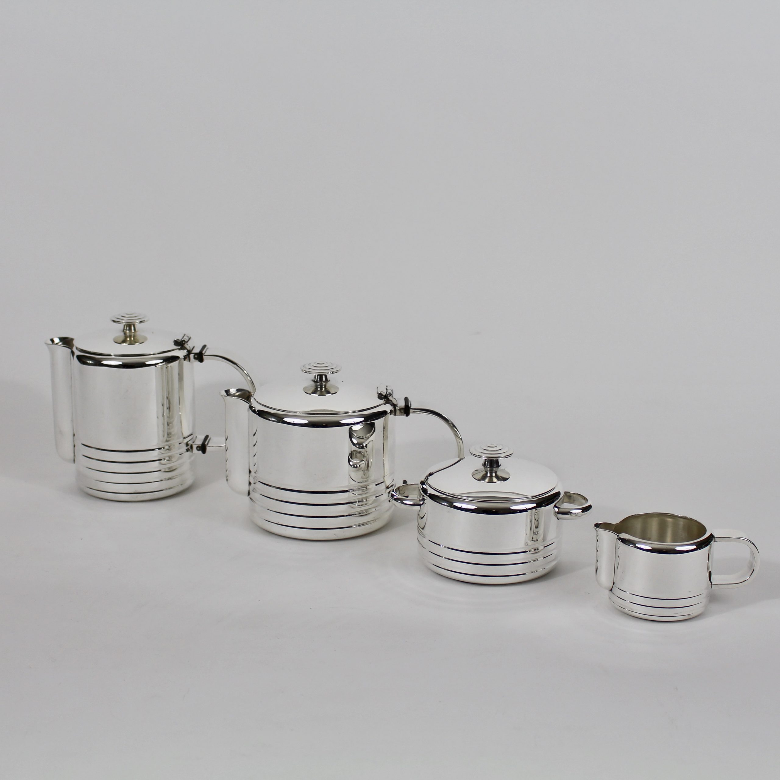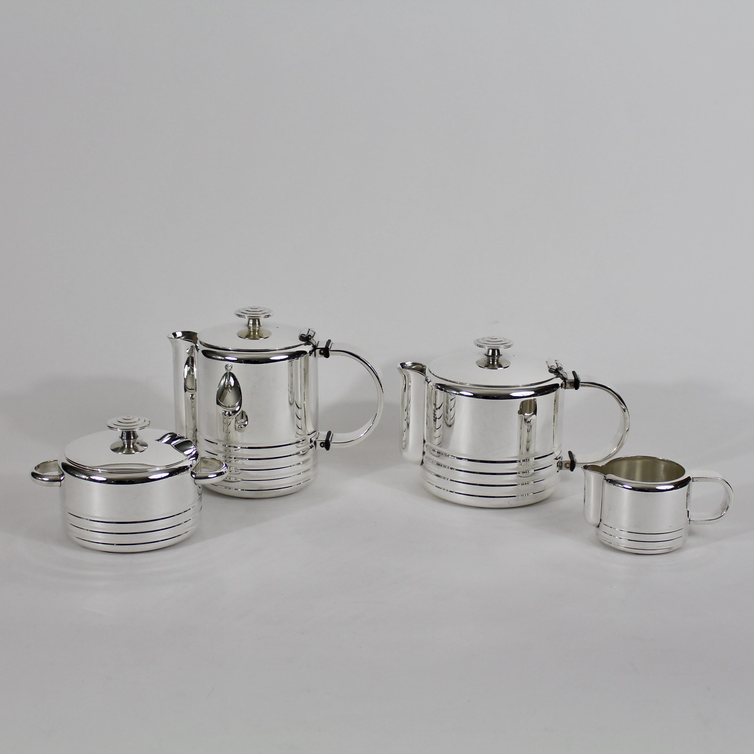 Service à café entièrement en métal argenté à décor de stries, d’inspiration moderniste.