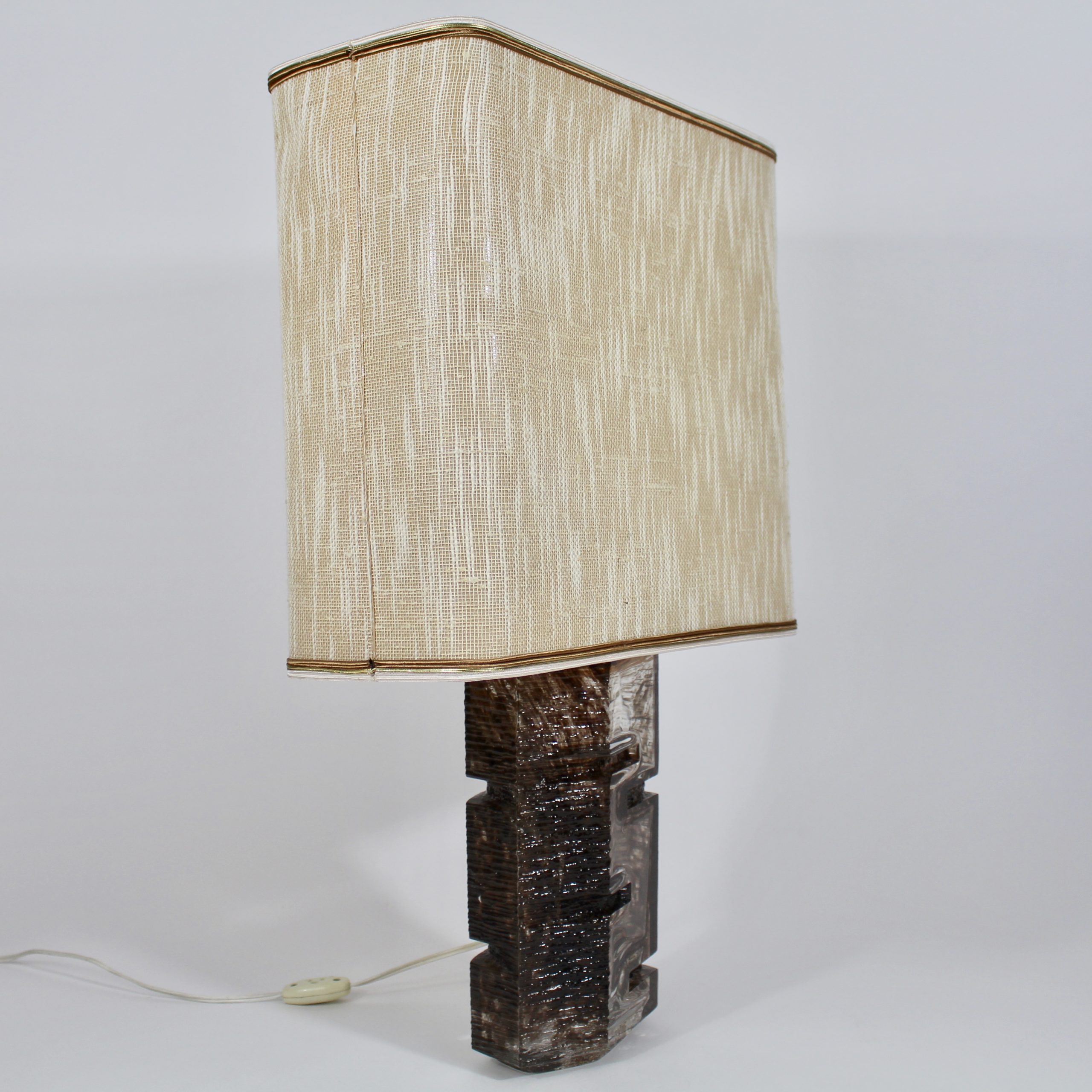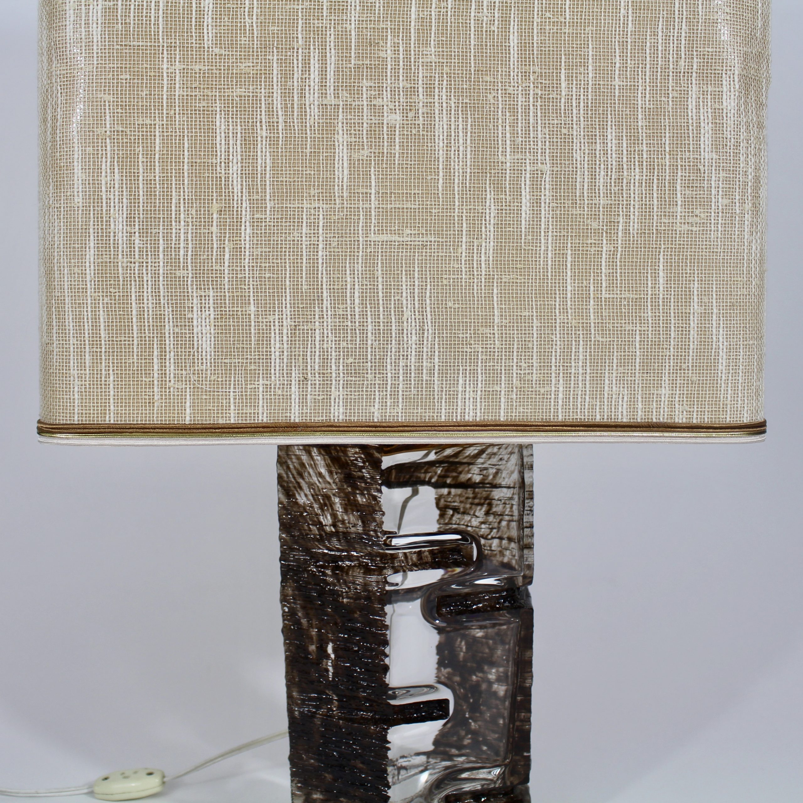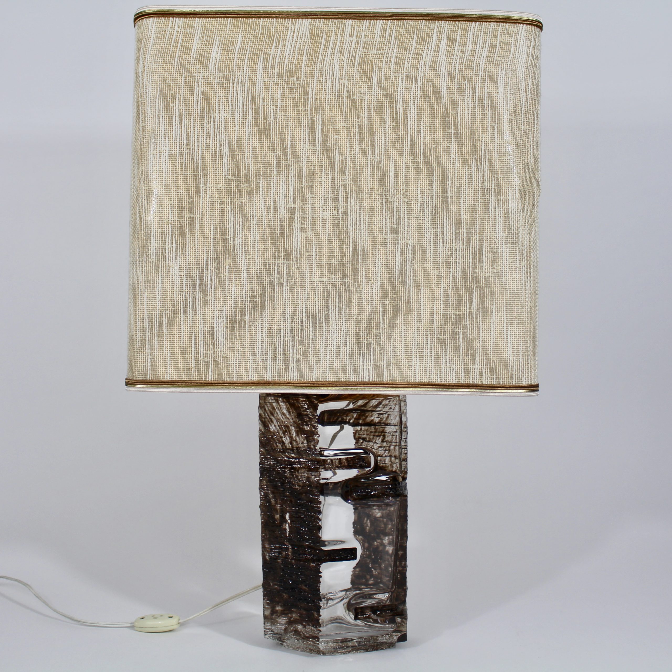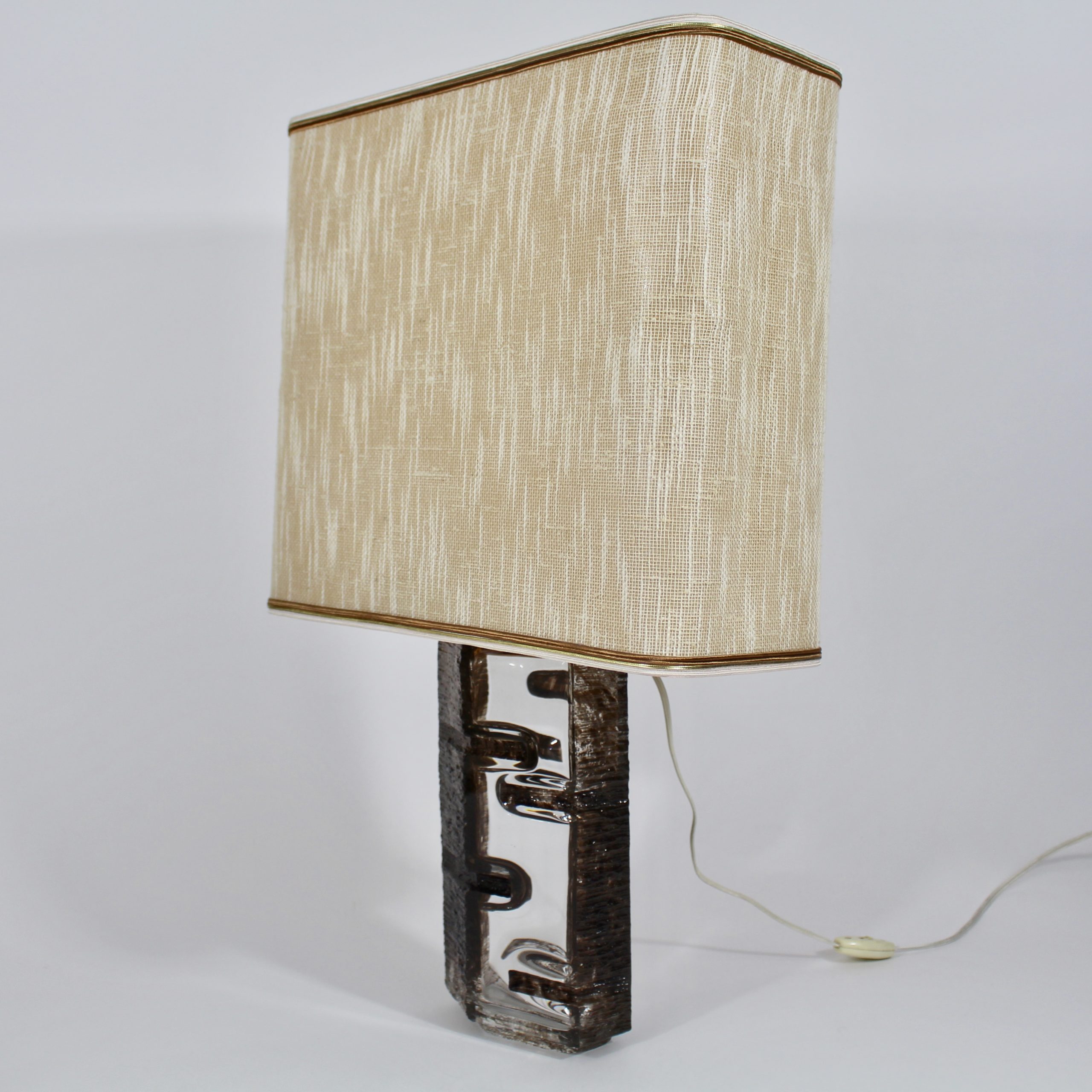 Elle se compose d’un pied de lampe en cristal émaillé brun et de son abat-jour en tissu d’origine.