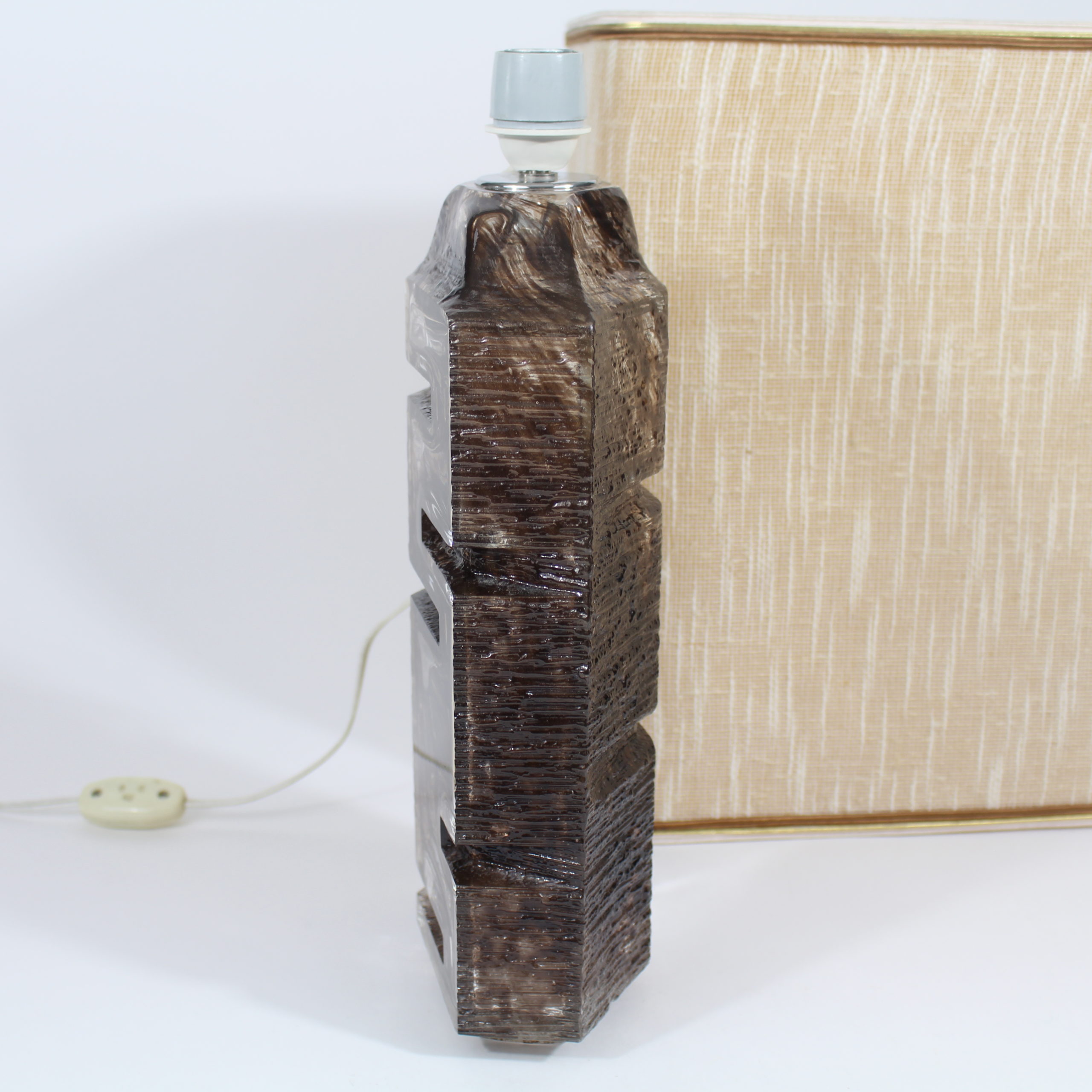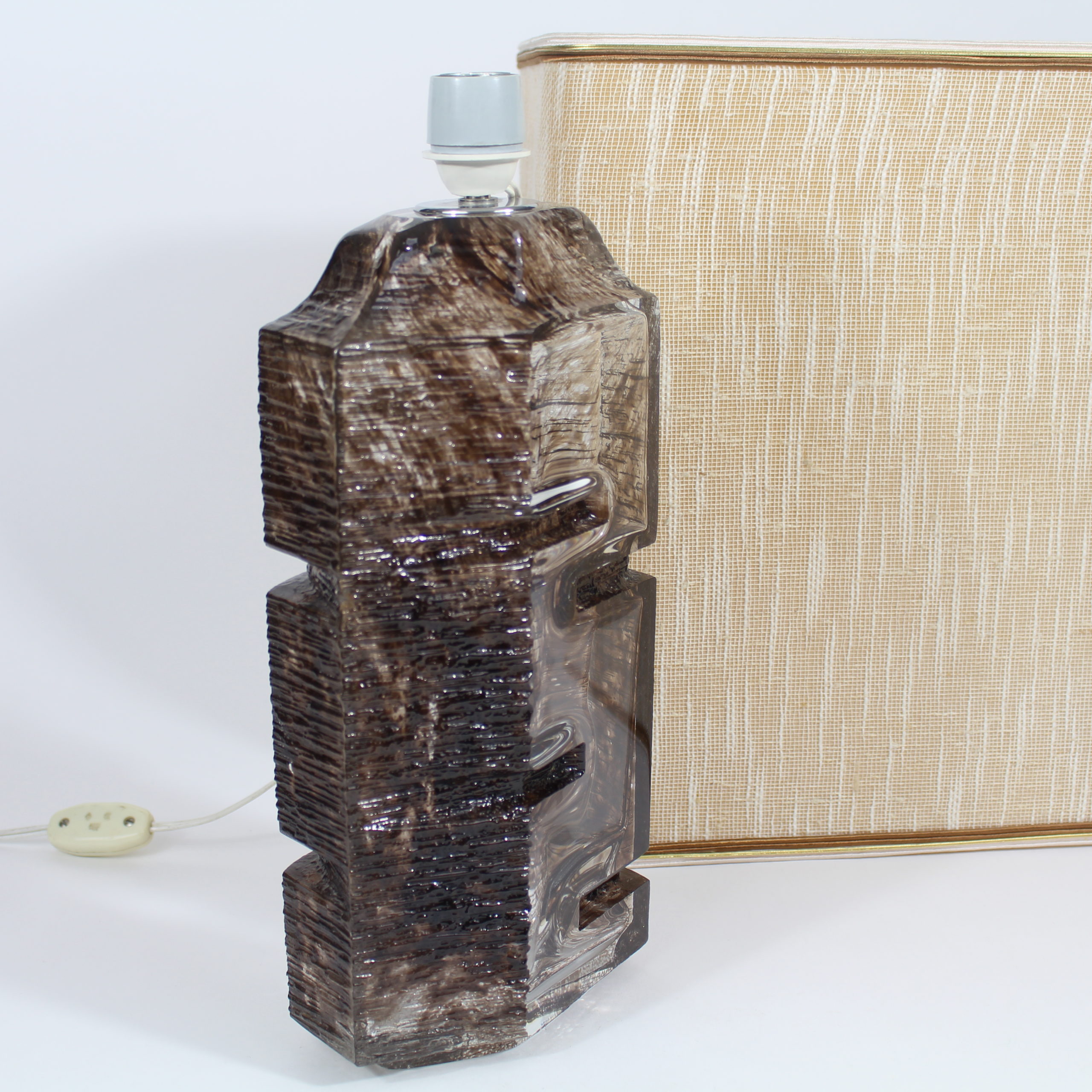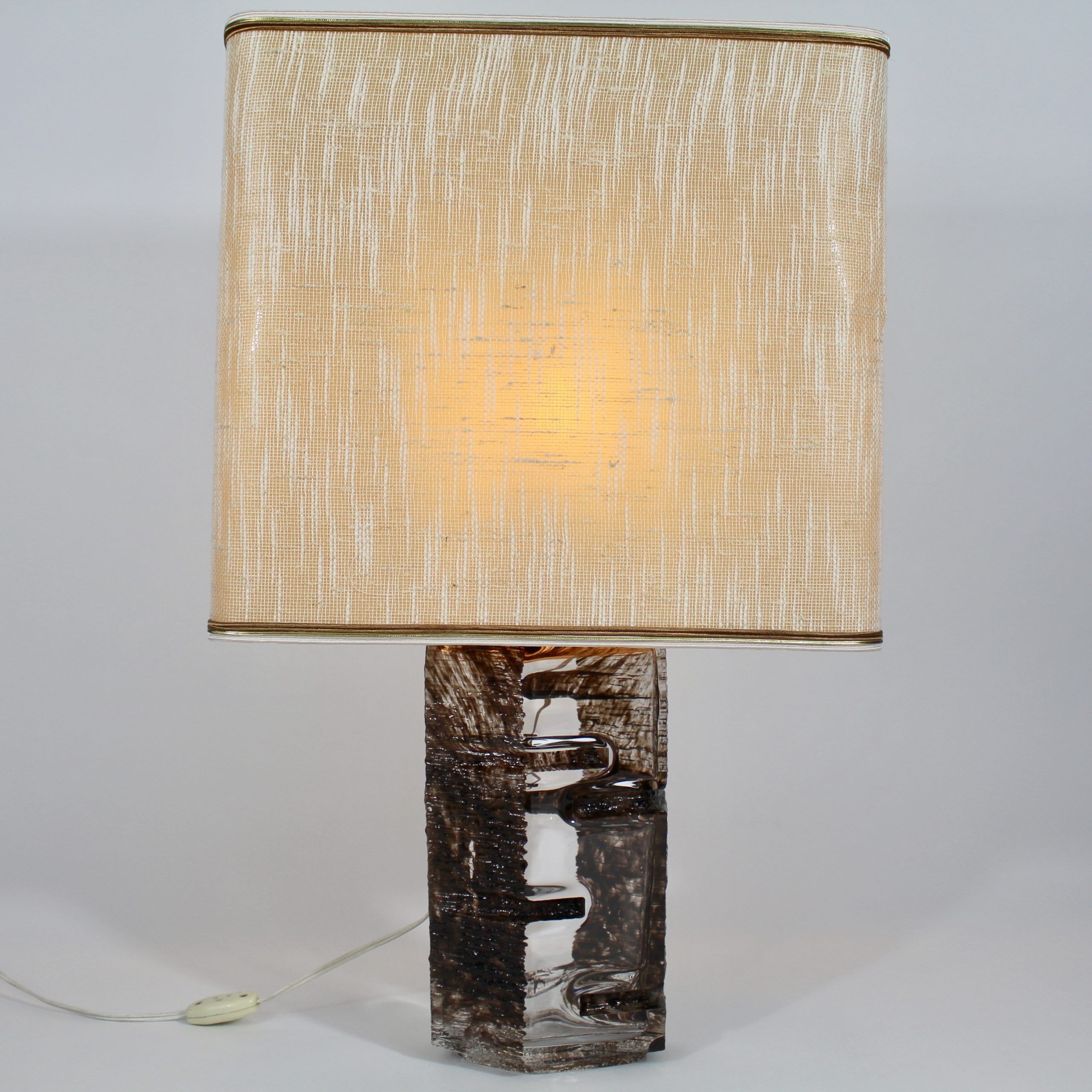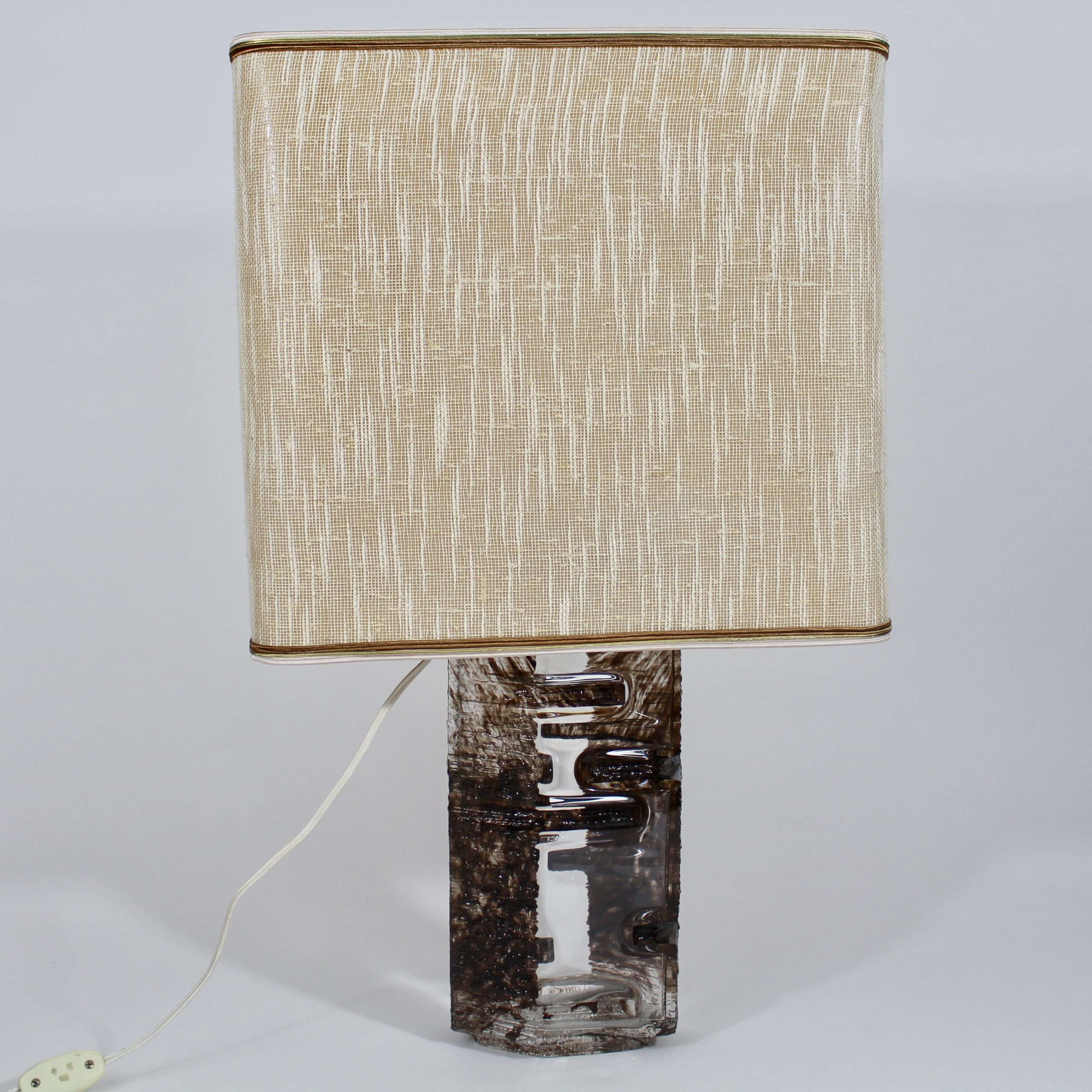 Elle se compose d’un pied de lampe en cristal émaillé brun et de son abat-jour en tissu d’origine.