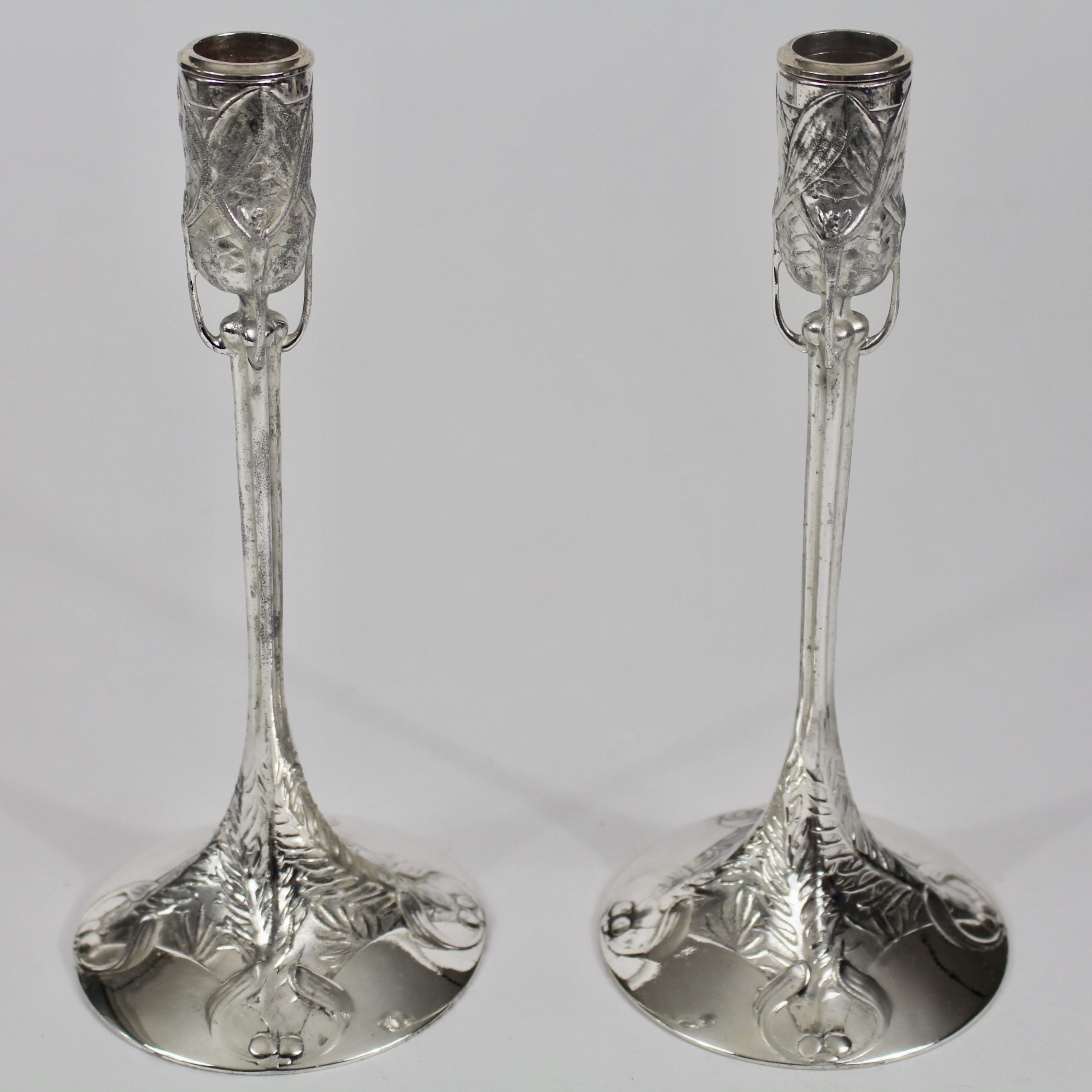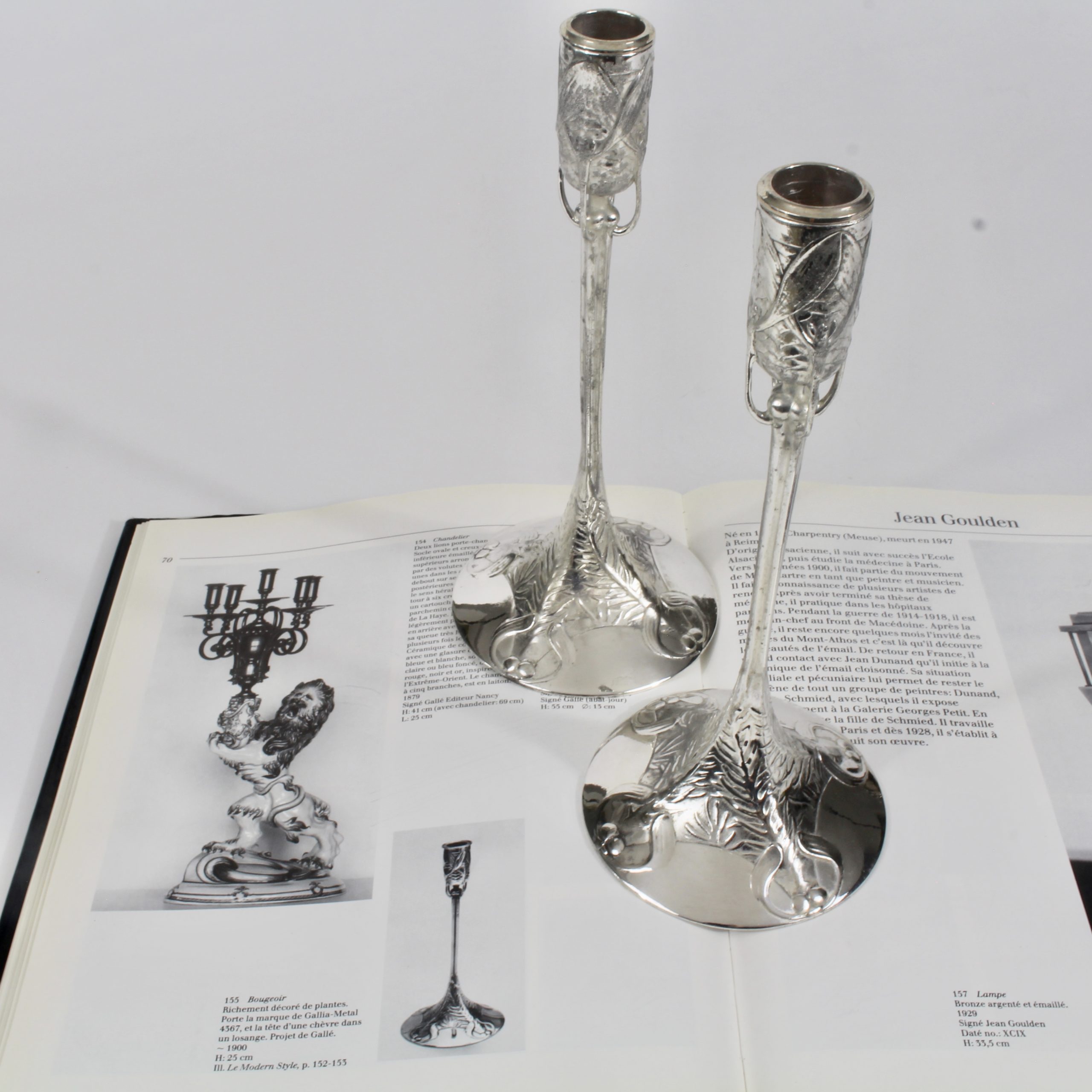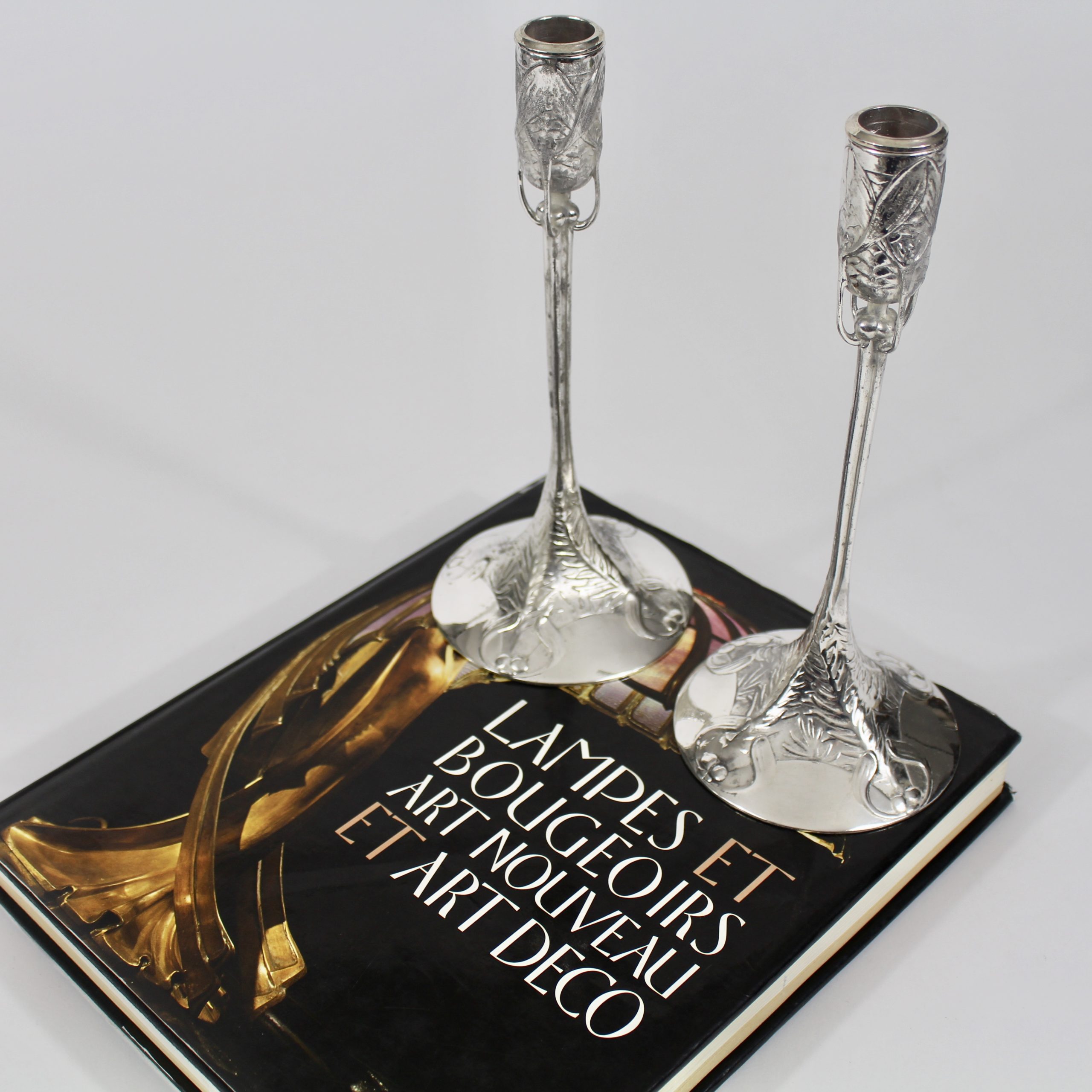 Très rare paire de bougeoirs en métal argenté d’époque Art Nouveau par Gallia.