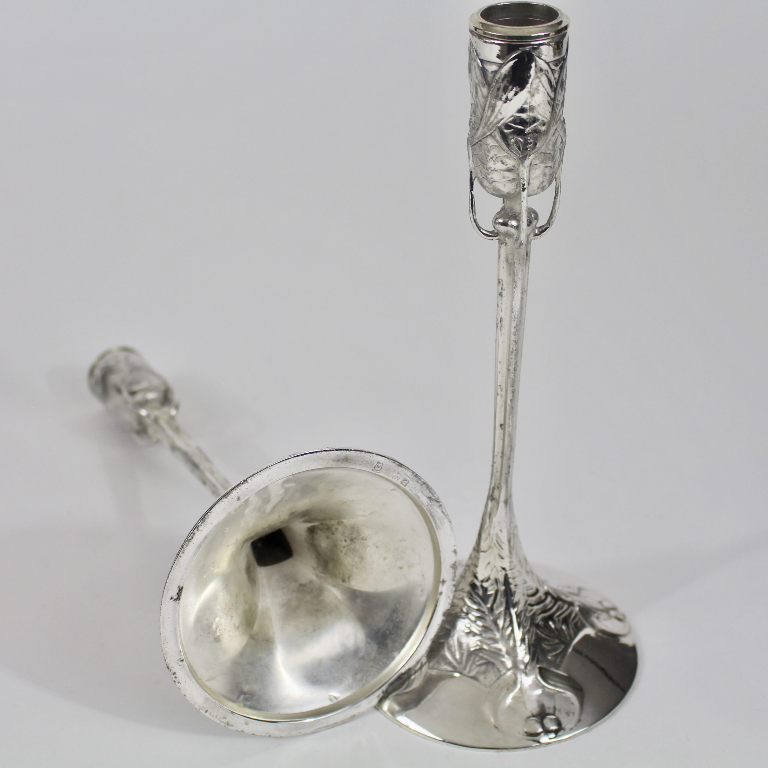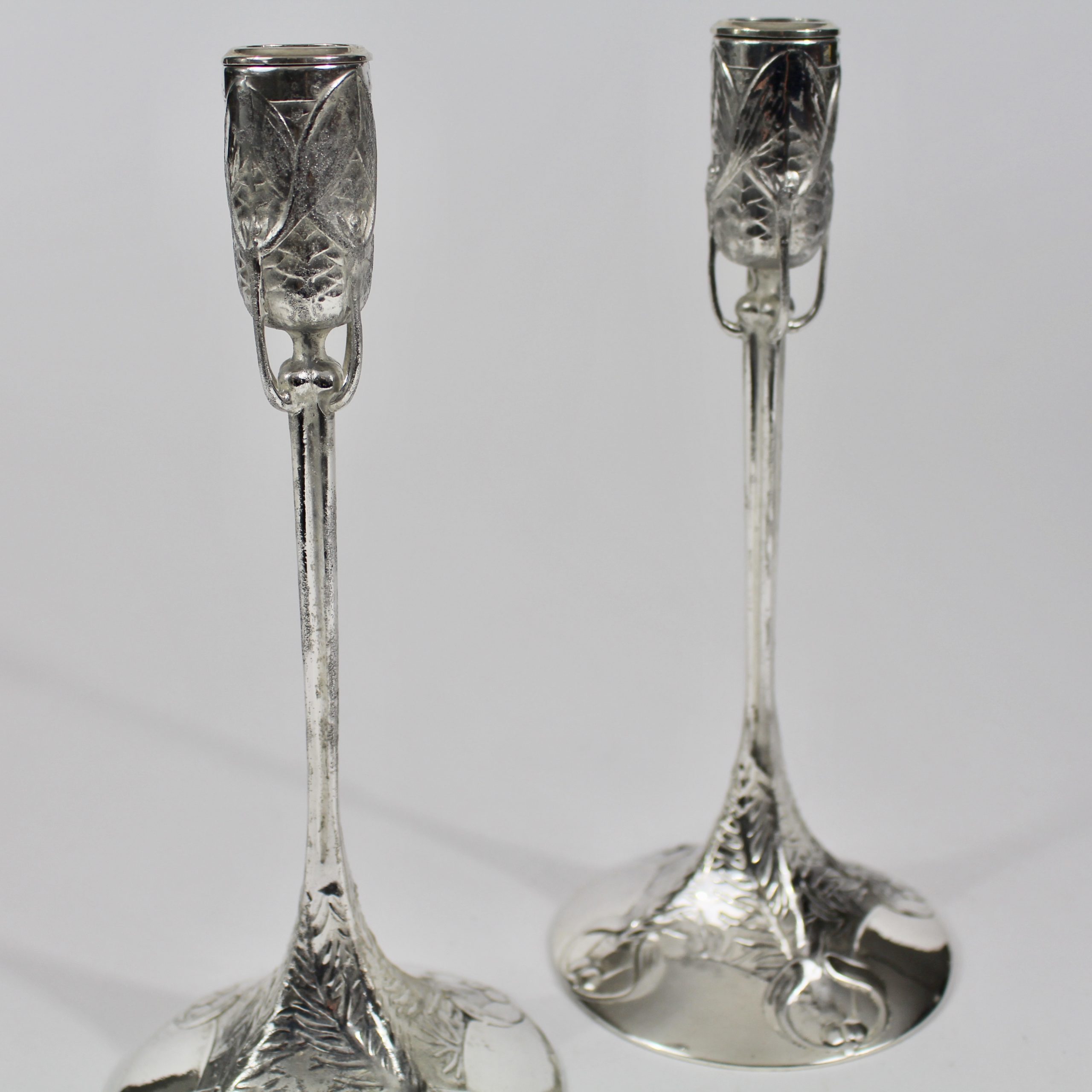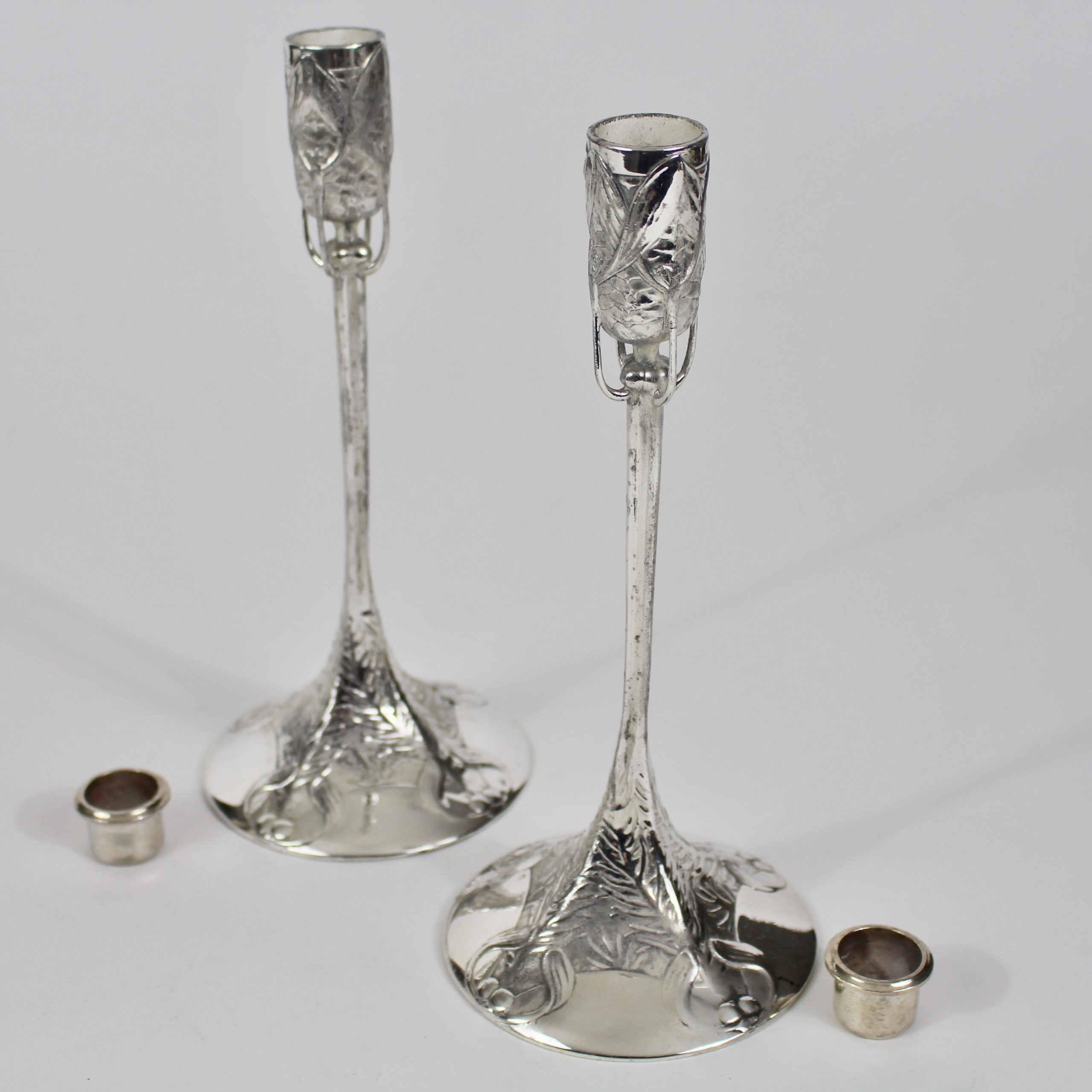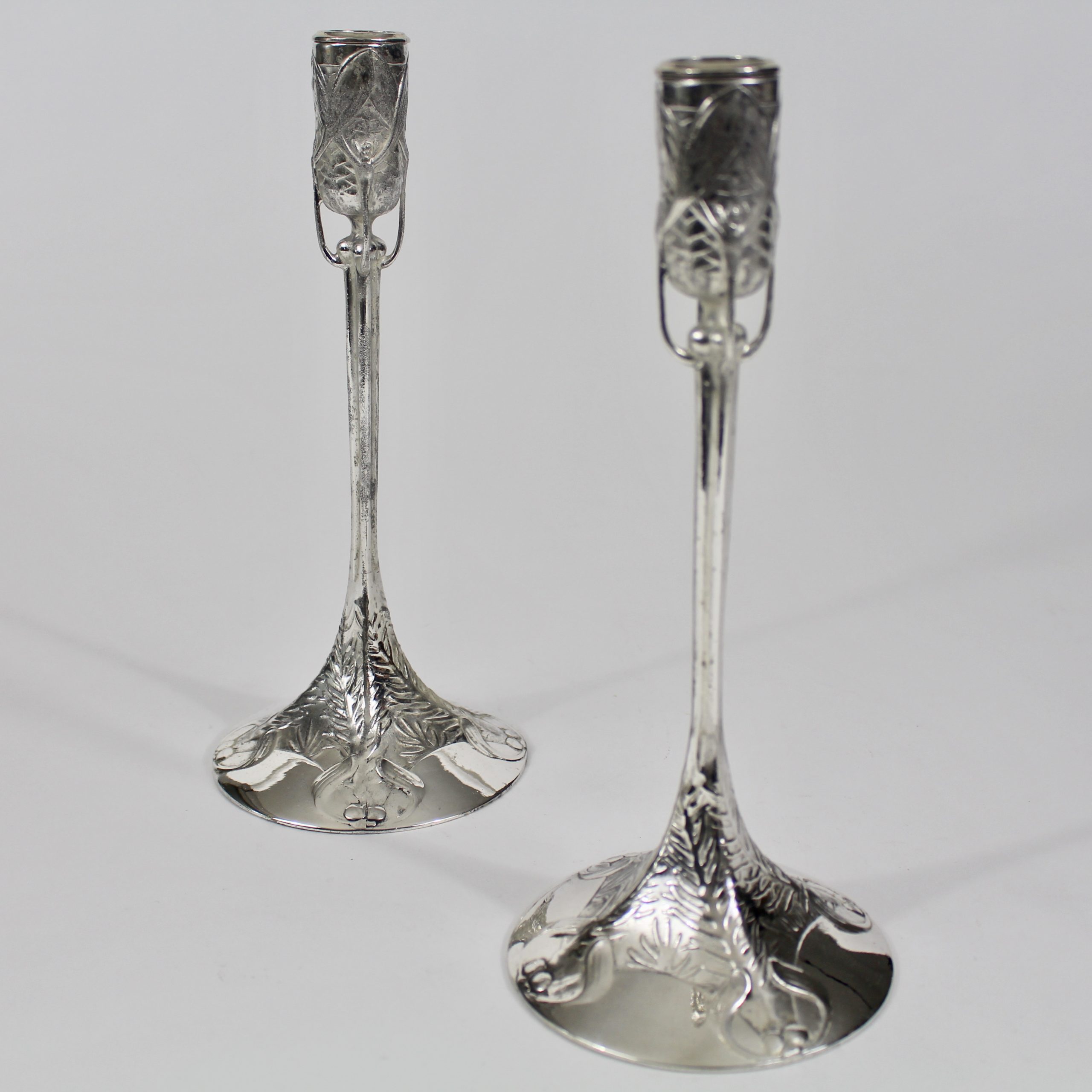 Très rare paire de bougeoirs en métal argenté d’époque Art Nouveau par Gallia.