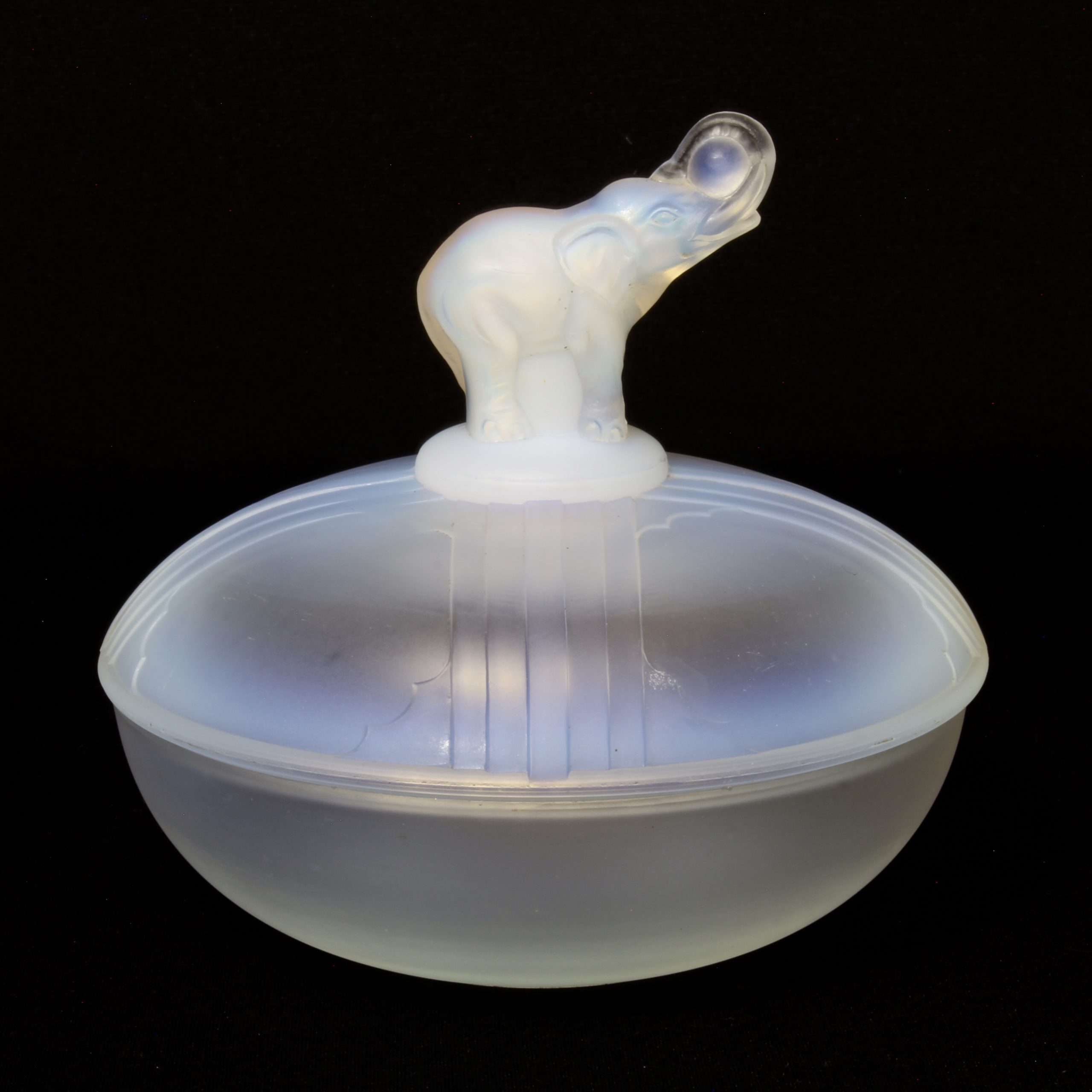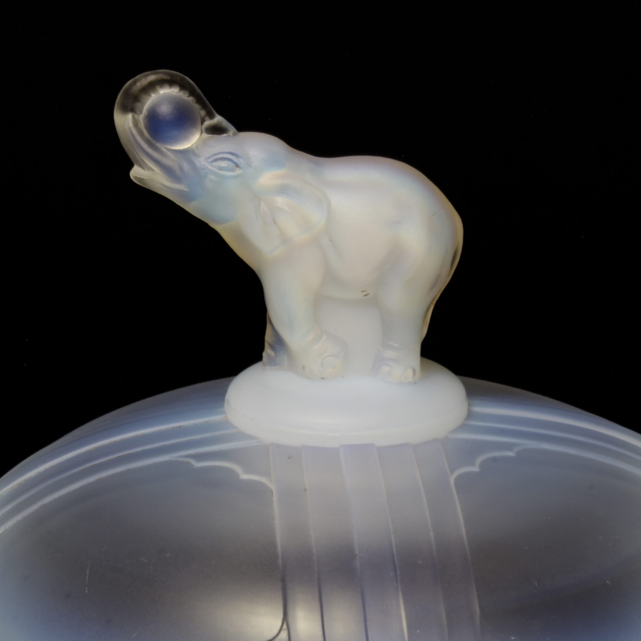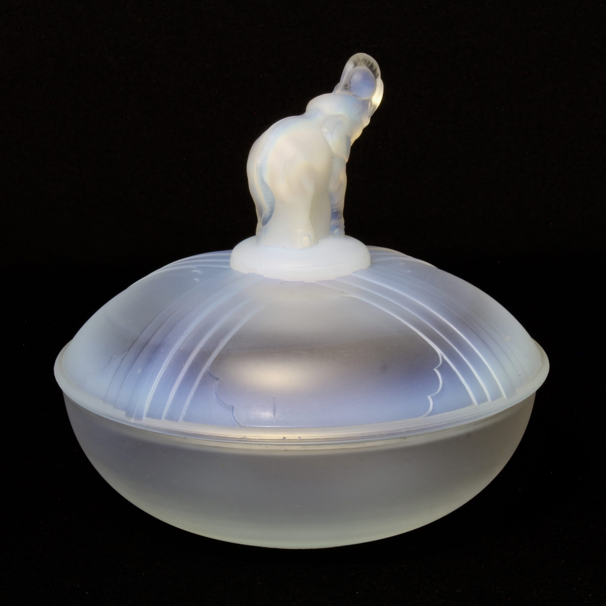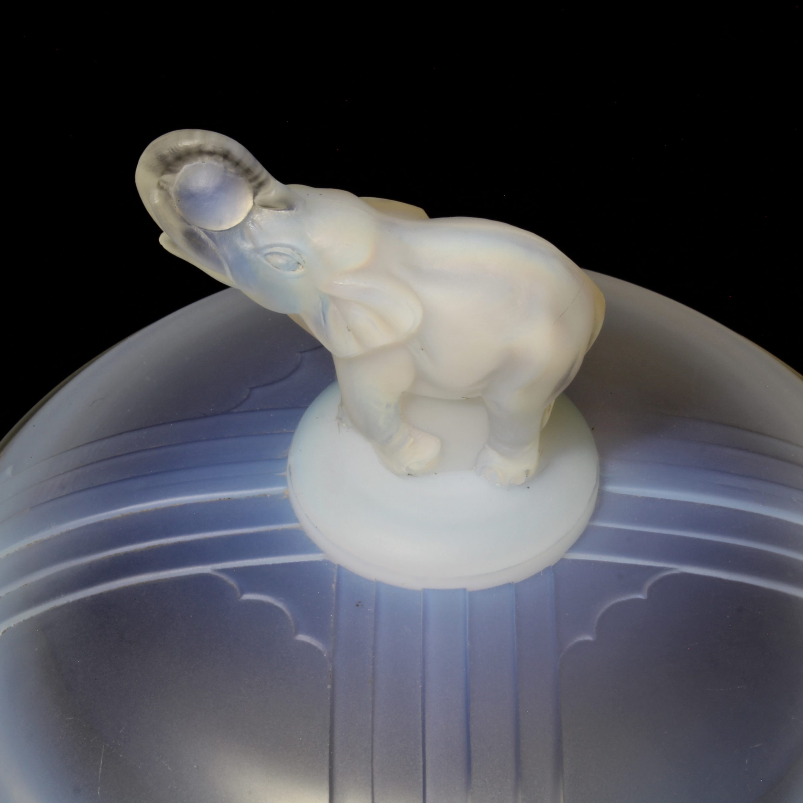 Elle se compose d’un couvercle au décor géométrique stylisé orné d’une prise représentant un éléphant tenant une boule entre sa trompe, base d’origine en verre opalescent.