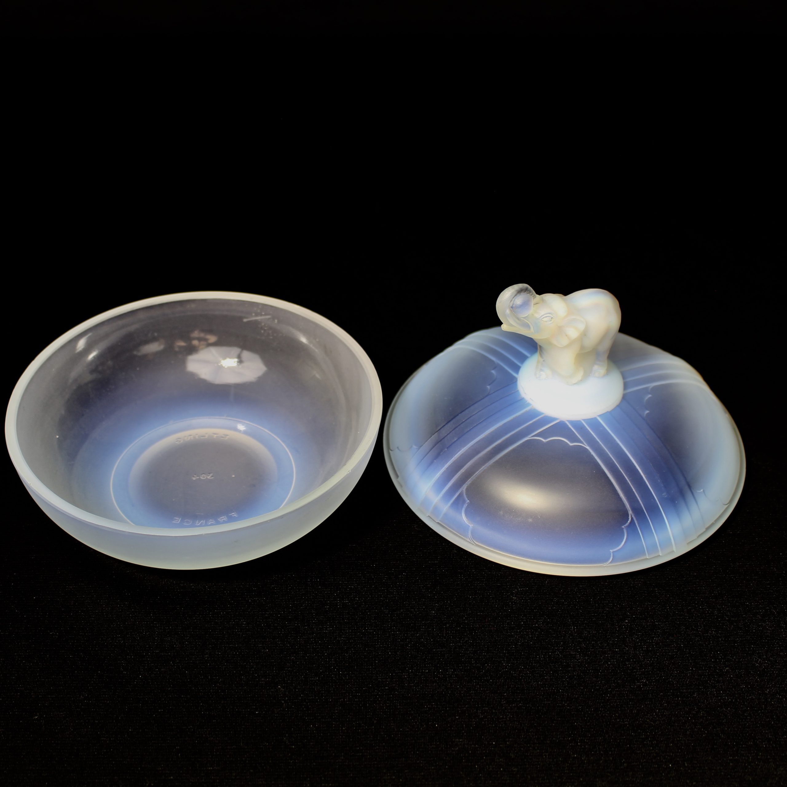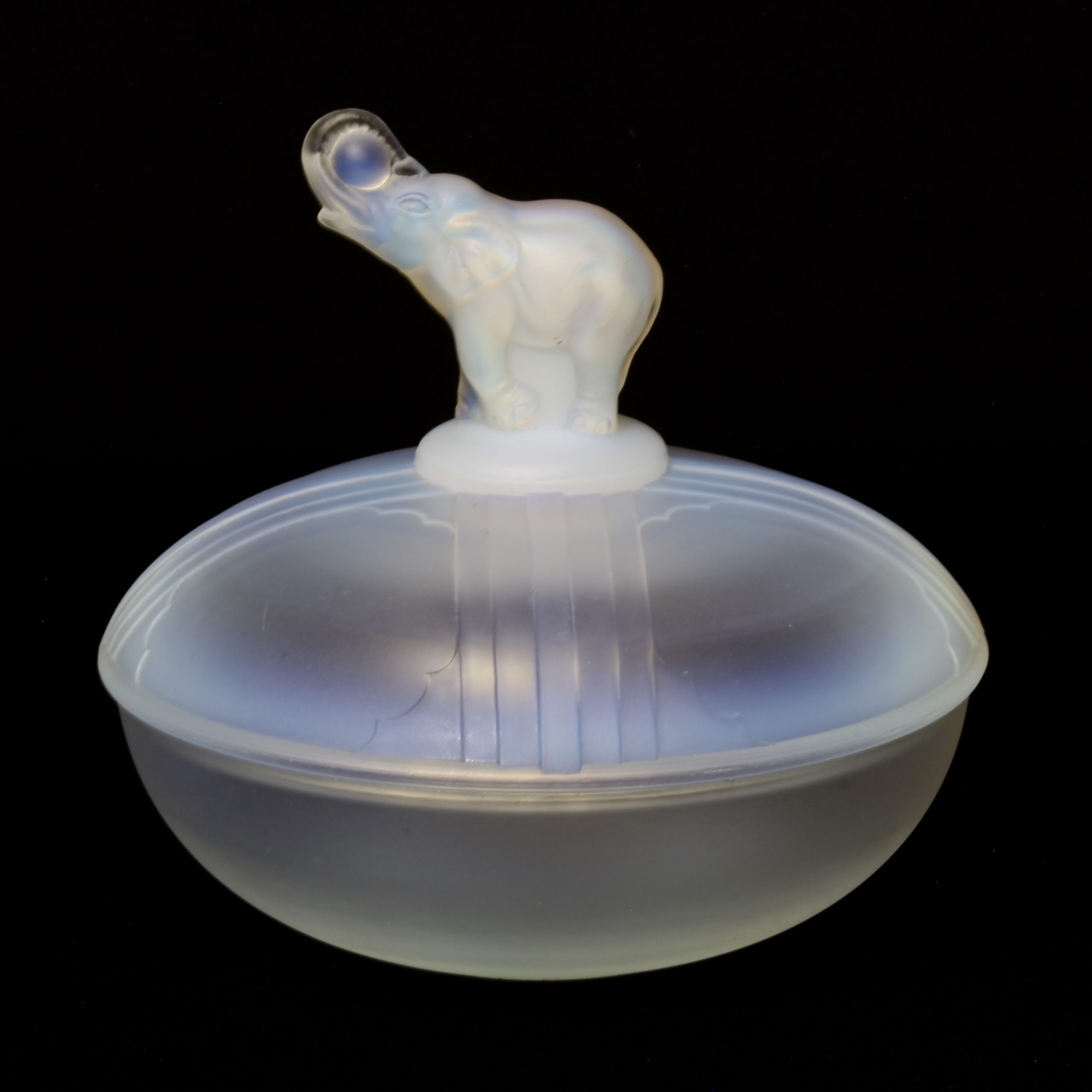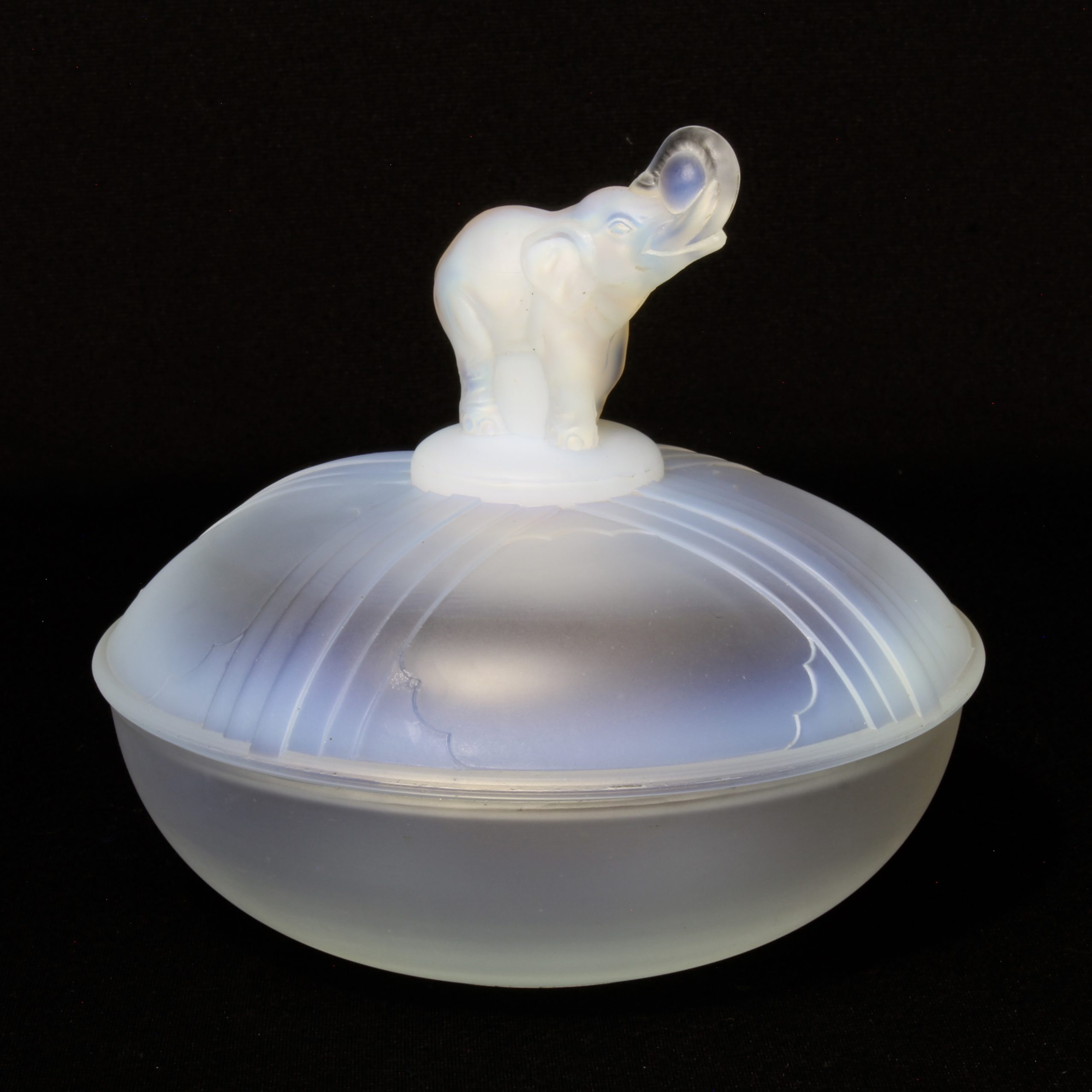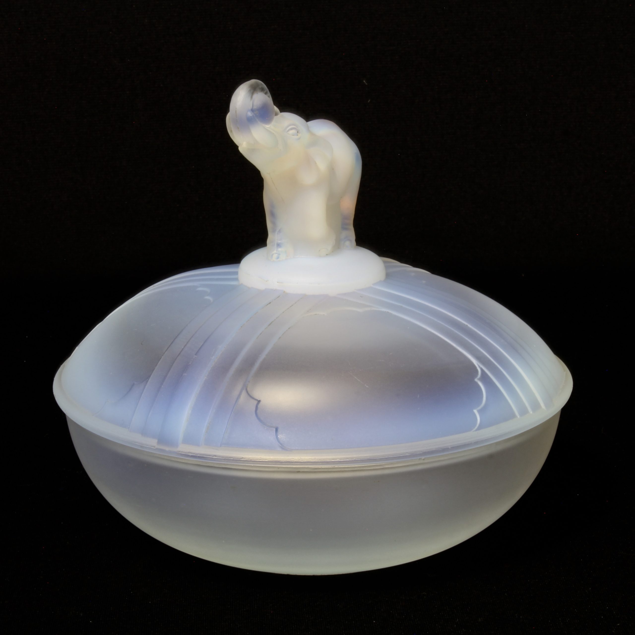 Elle se compose d’un couvercle au décor géométrique stylisé orné d’une prise représentant un éléphant tenant une boule entre sa trompe, base d’origine en verre opalescent.