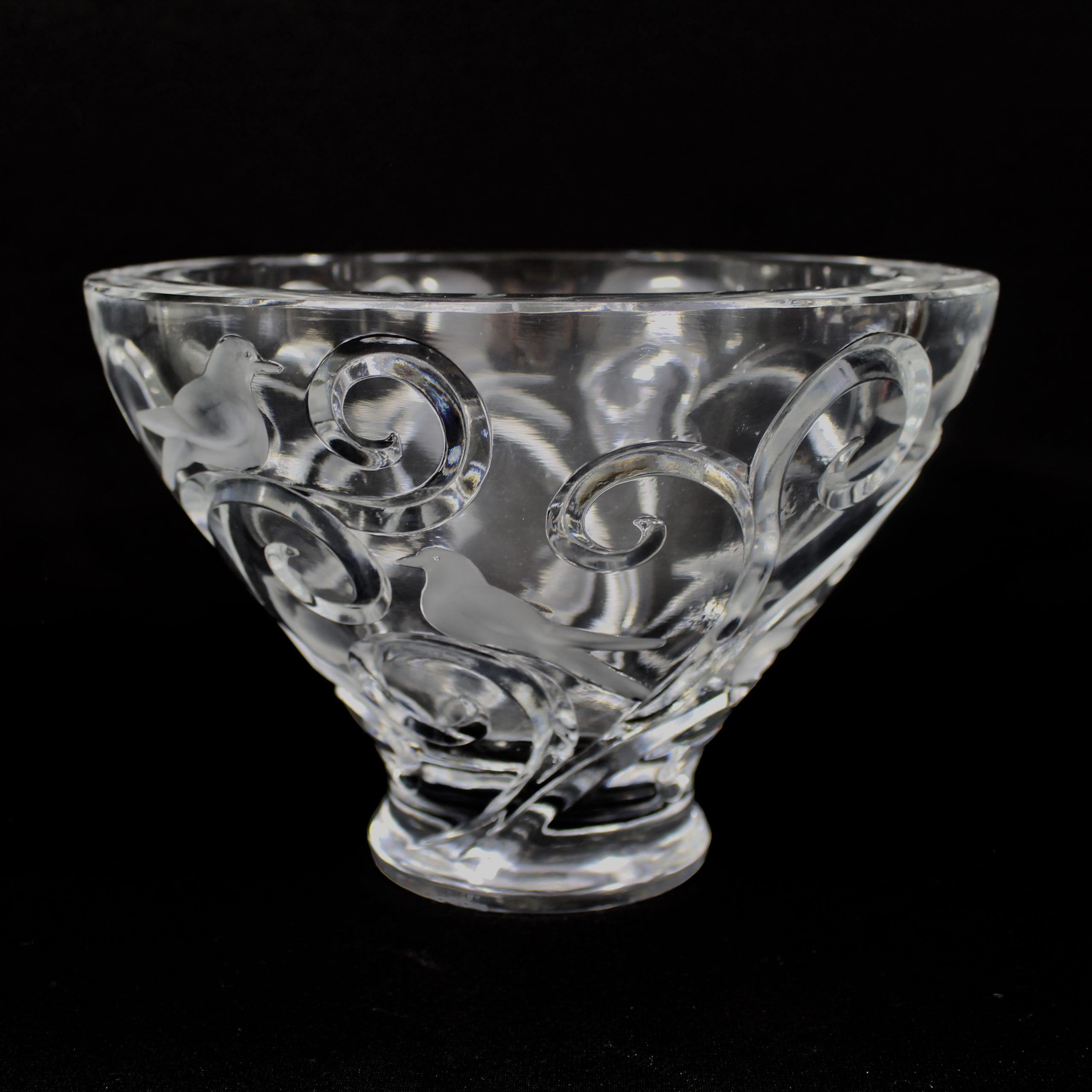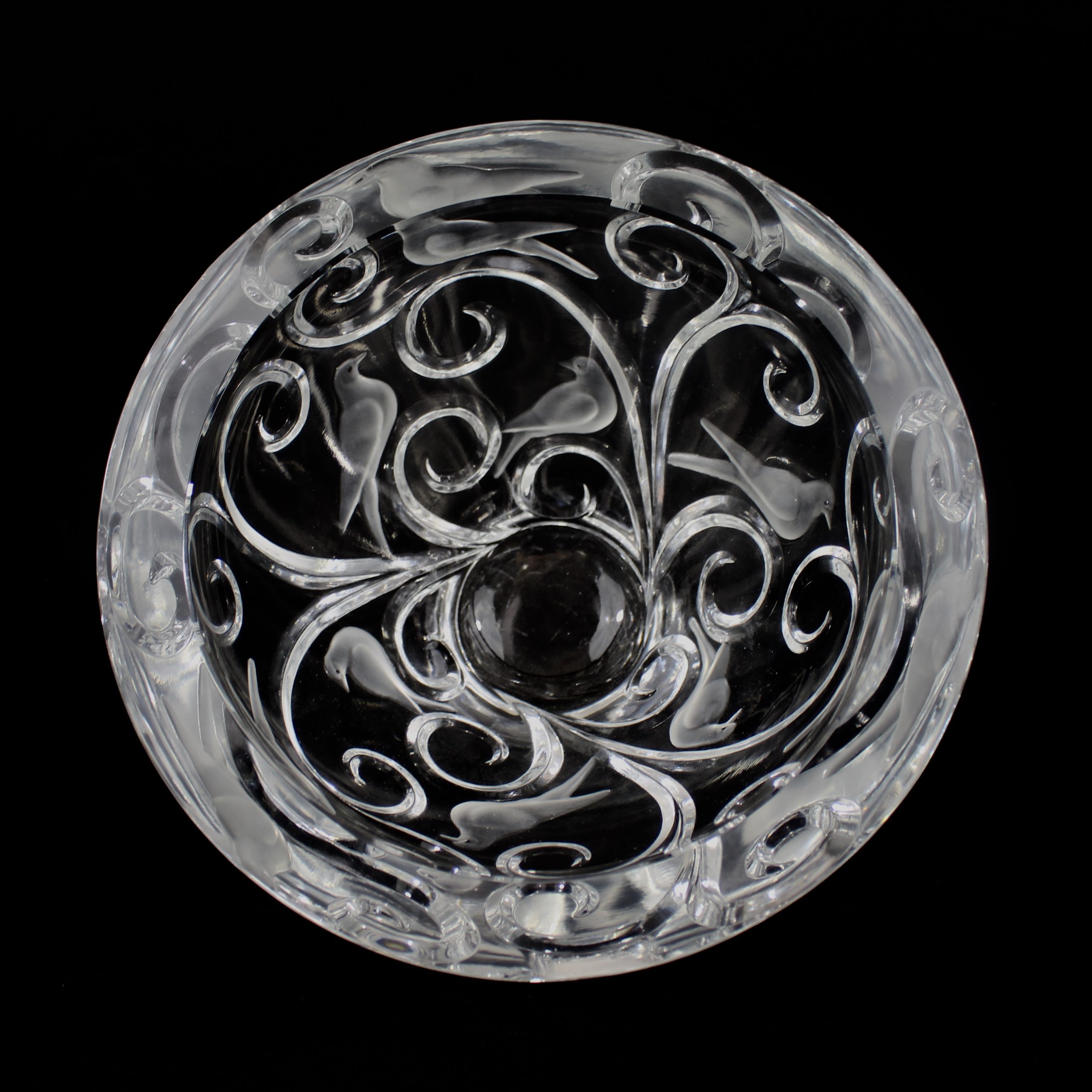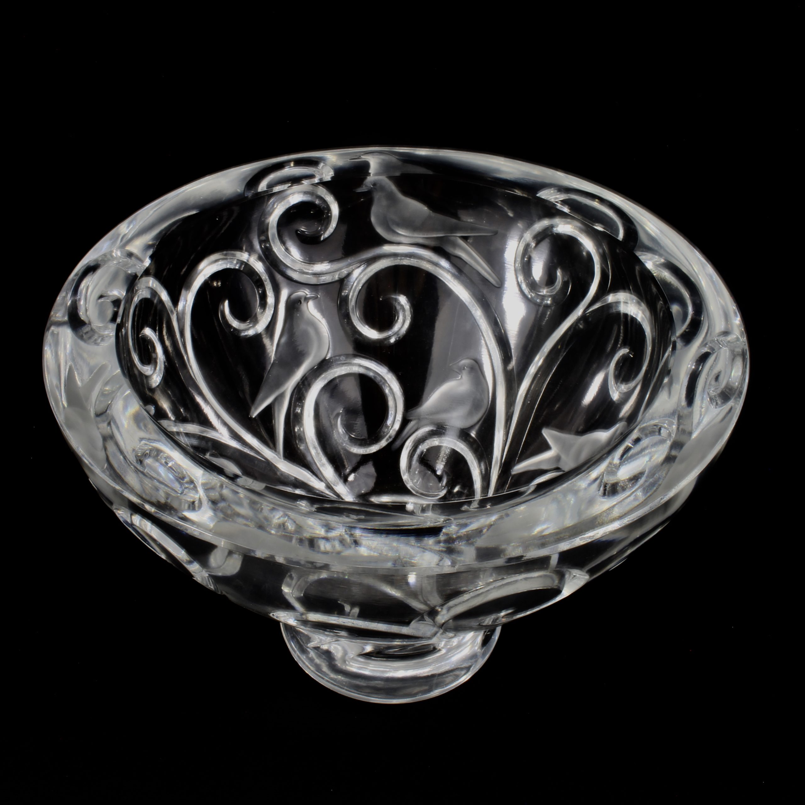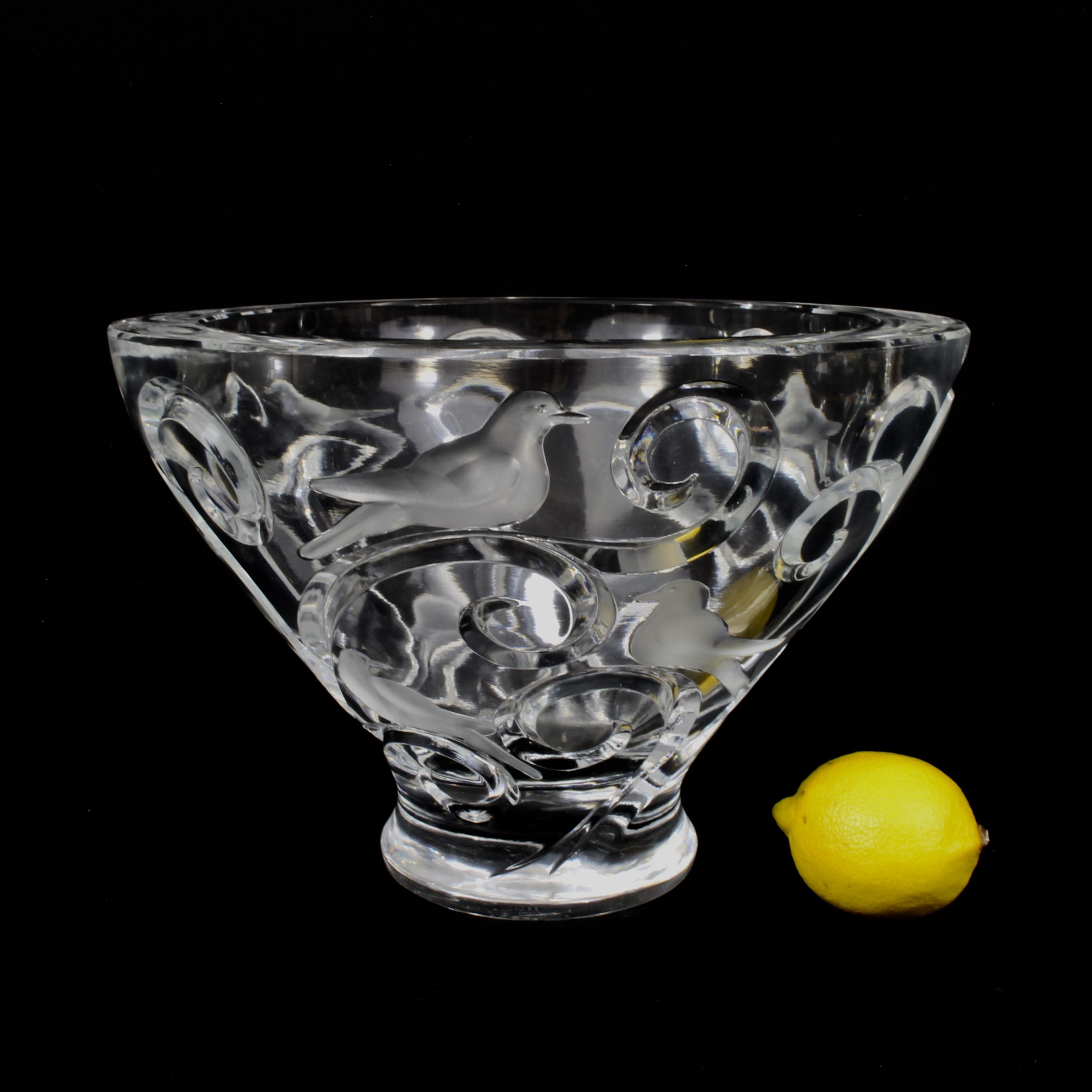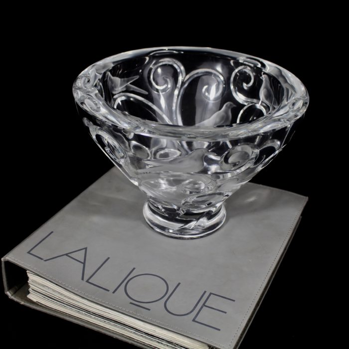 Grande coupe, pouvant former centre de table, à décor d’oiseaux et de branchages en cristal translucide et satiné.