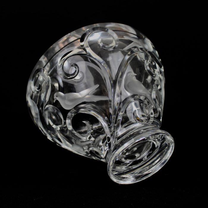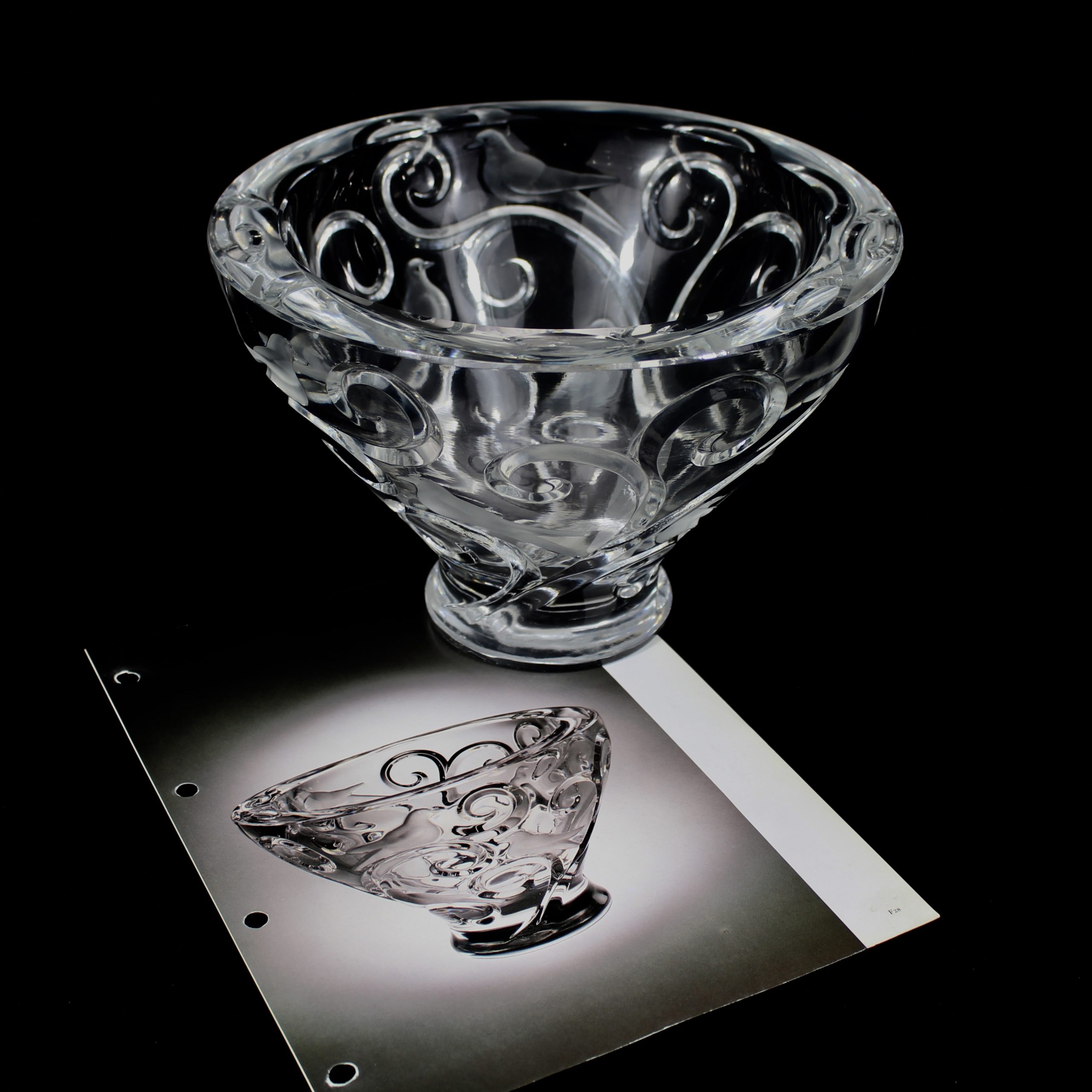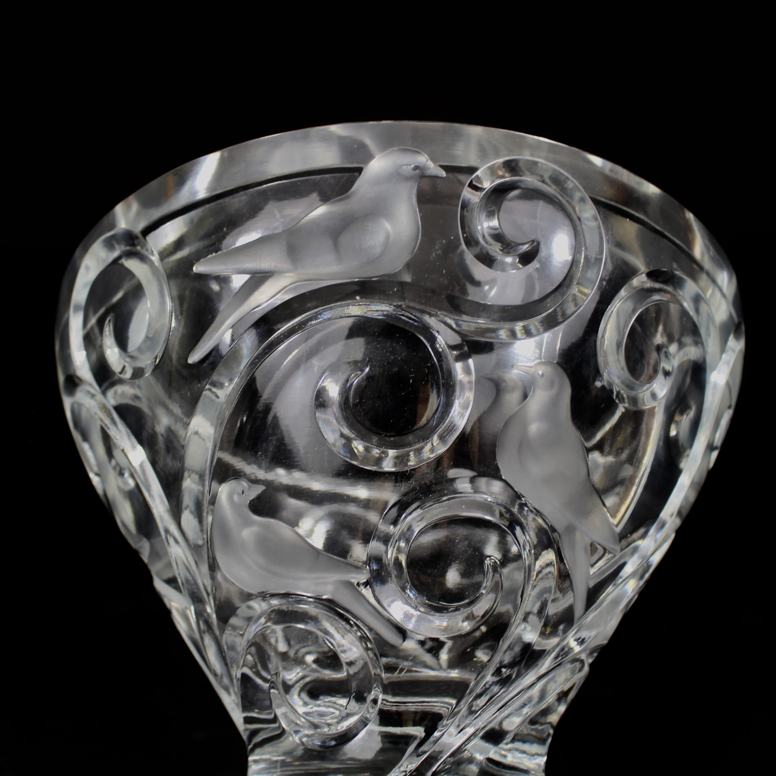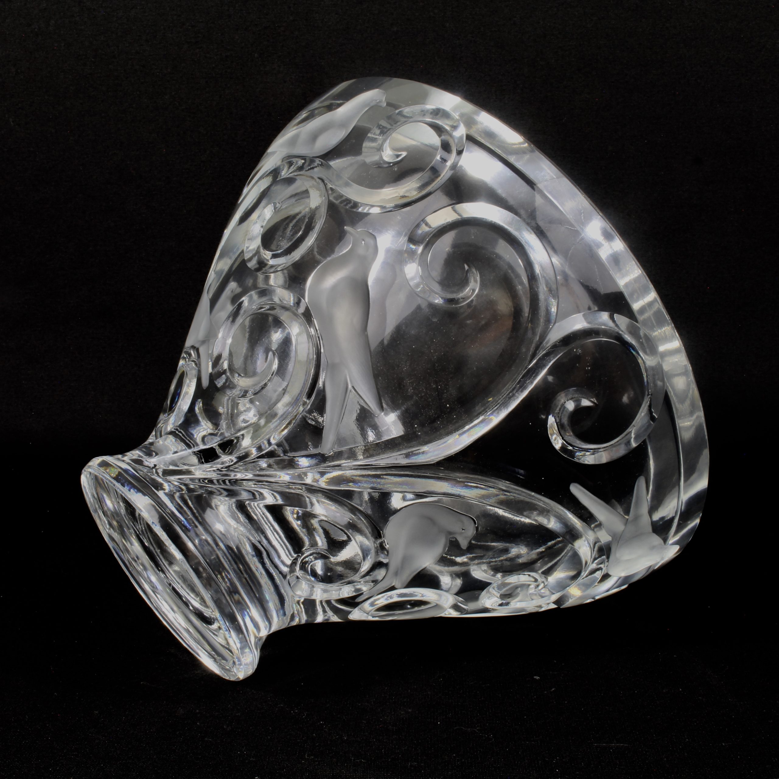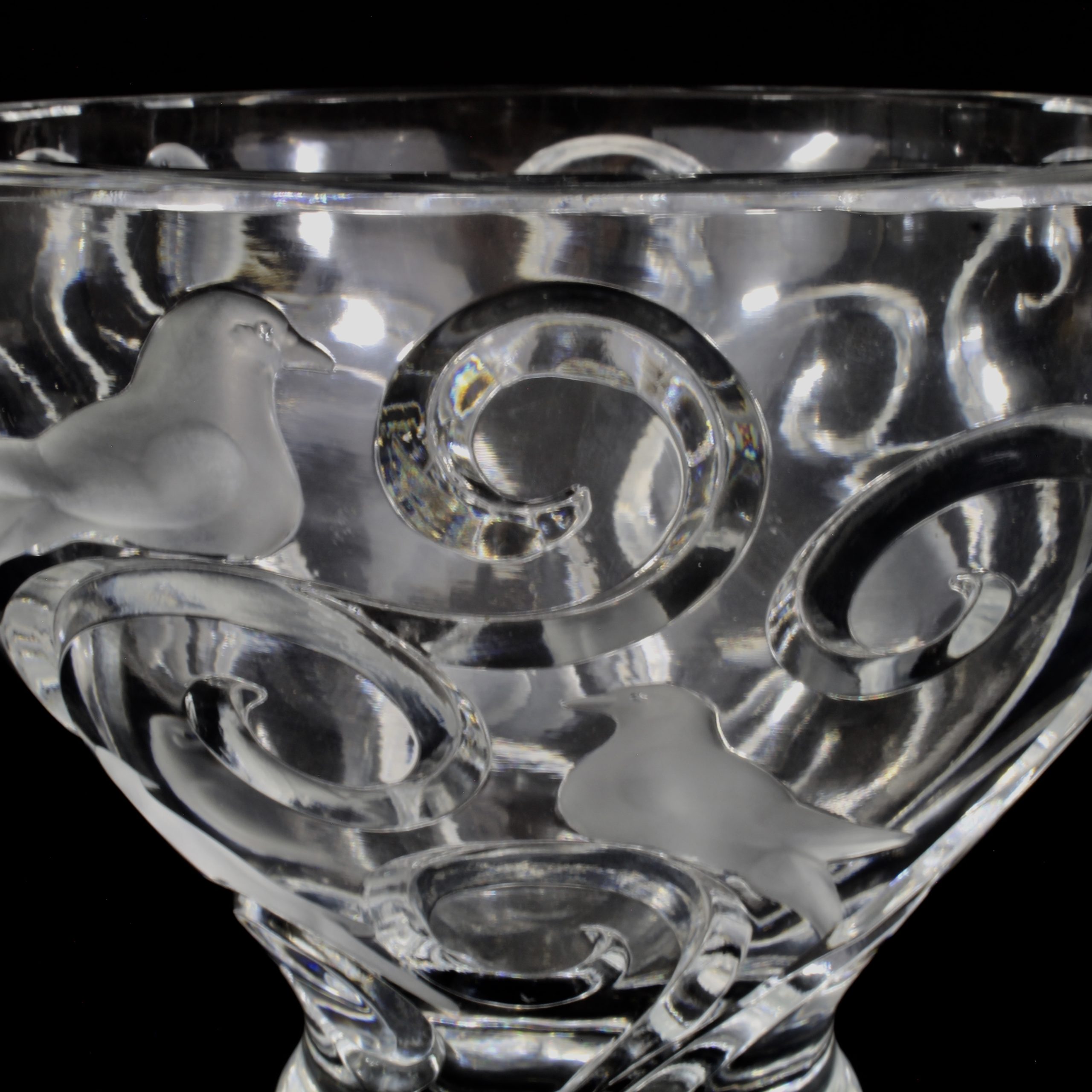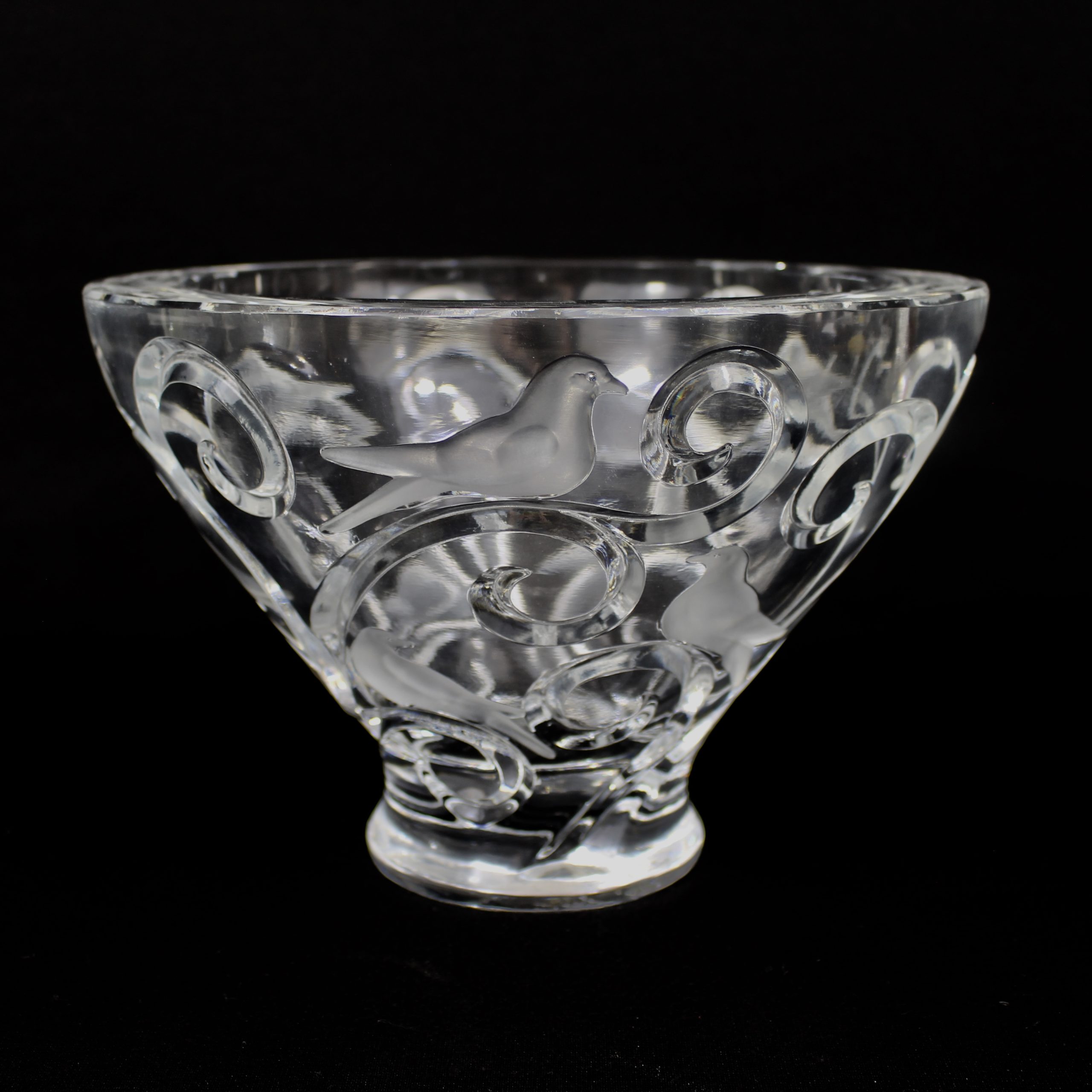 Grande coupe, pouvant former centre de table, à décor d’oiseaux et de branchages en cristal translucide et satiné.