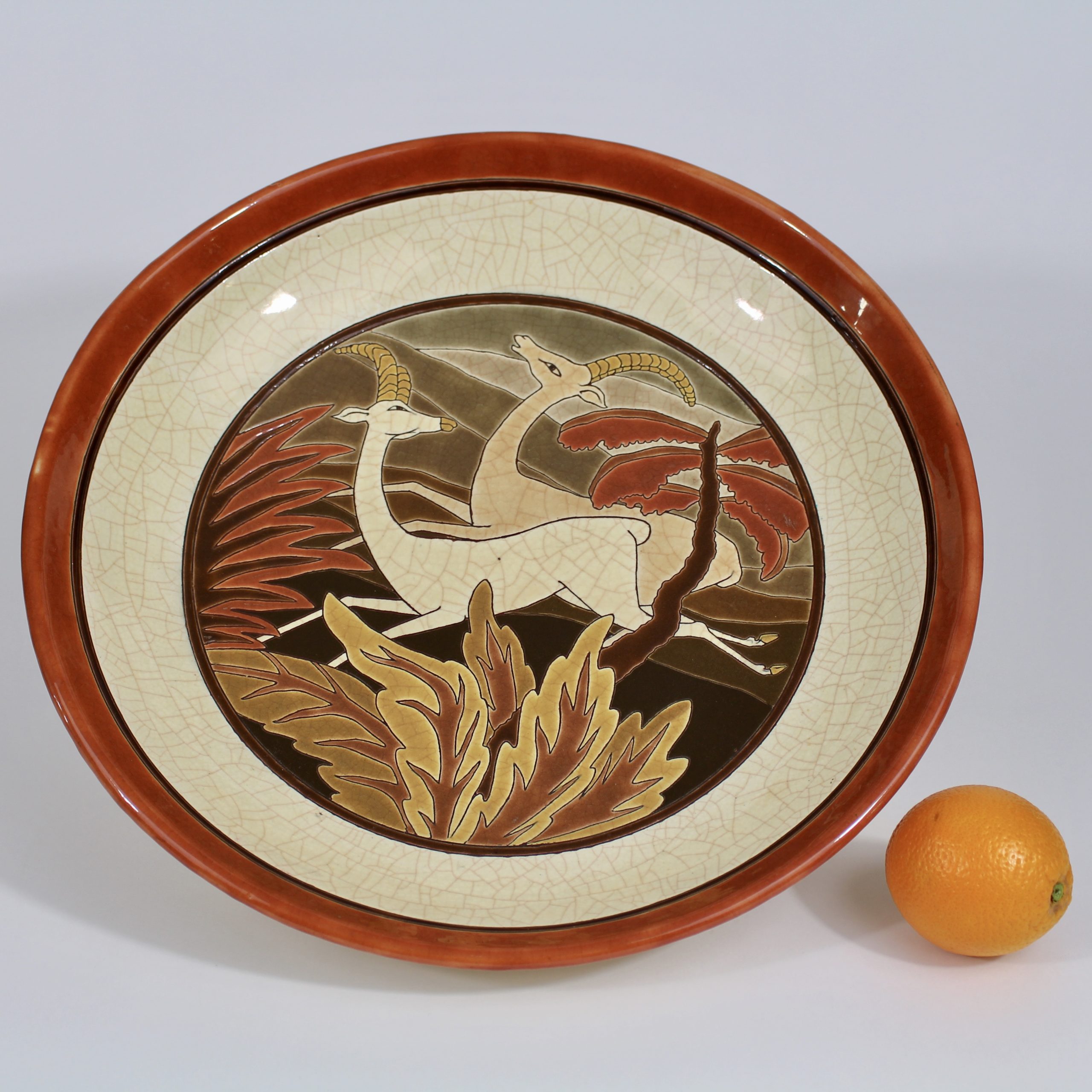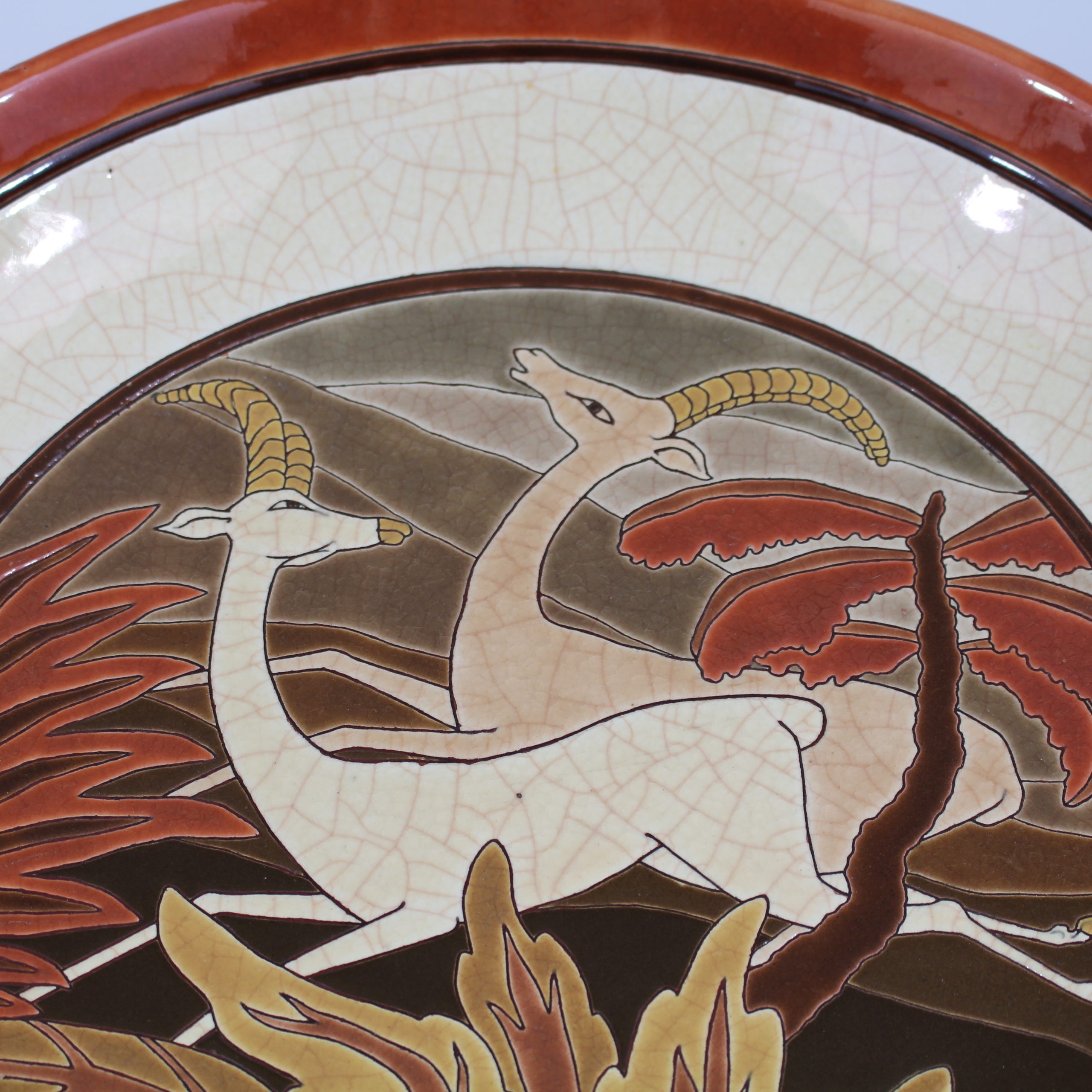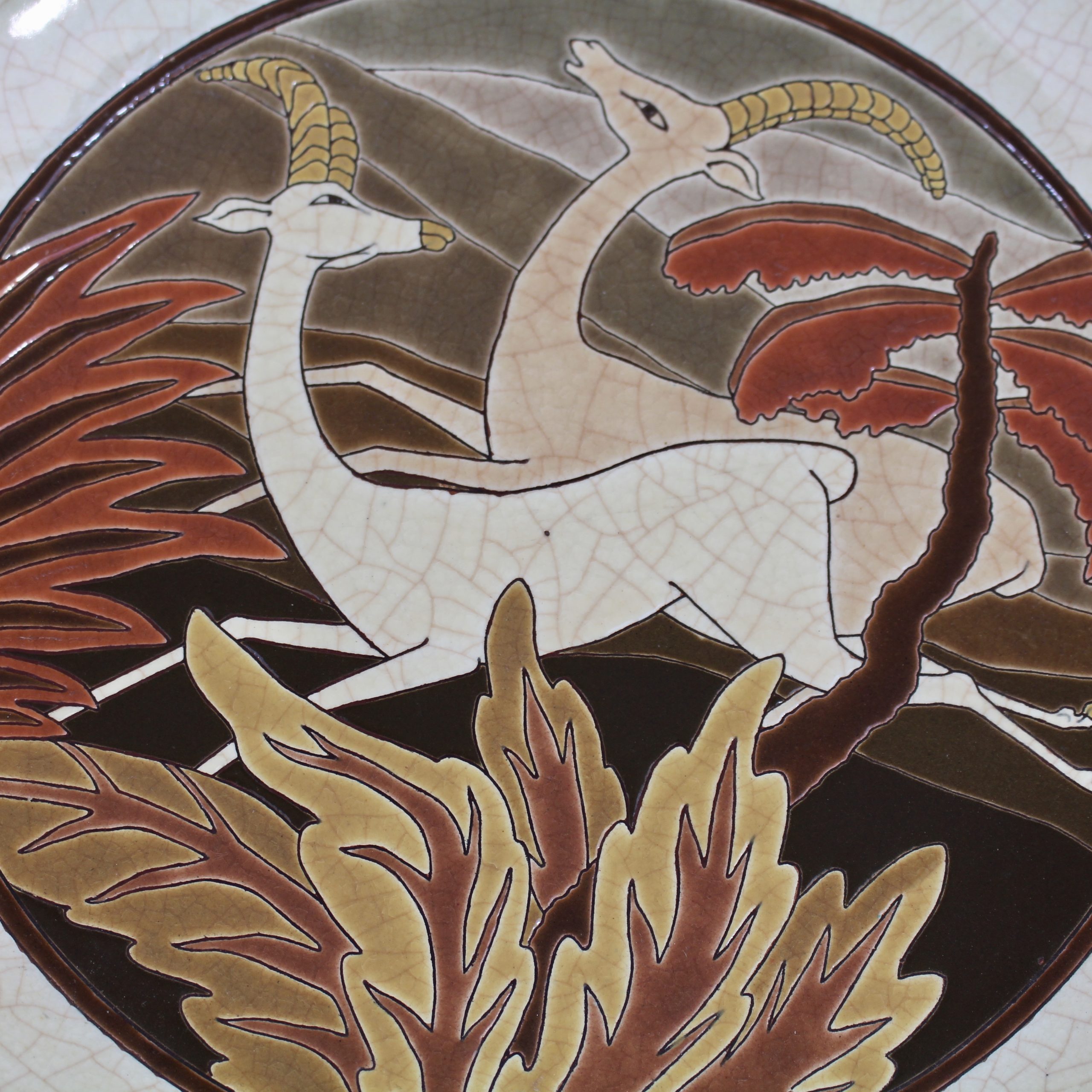Grand plat rond en faïence craquelée et émaillée à décor stylisé de biches sur un fond floral.