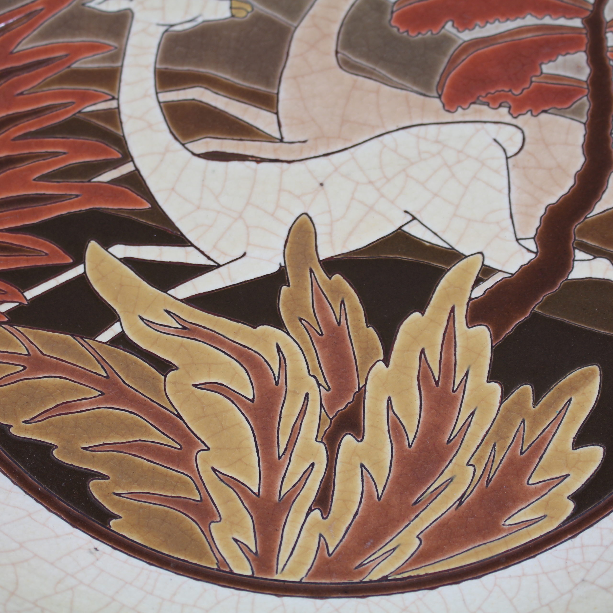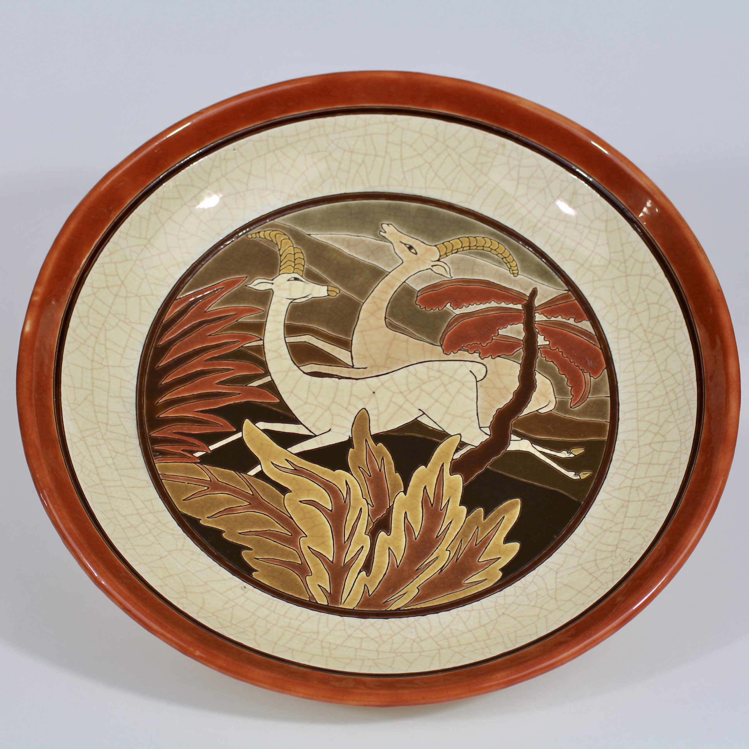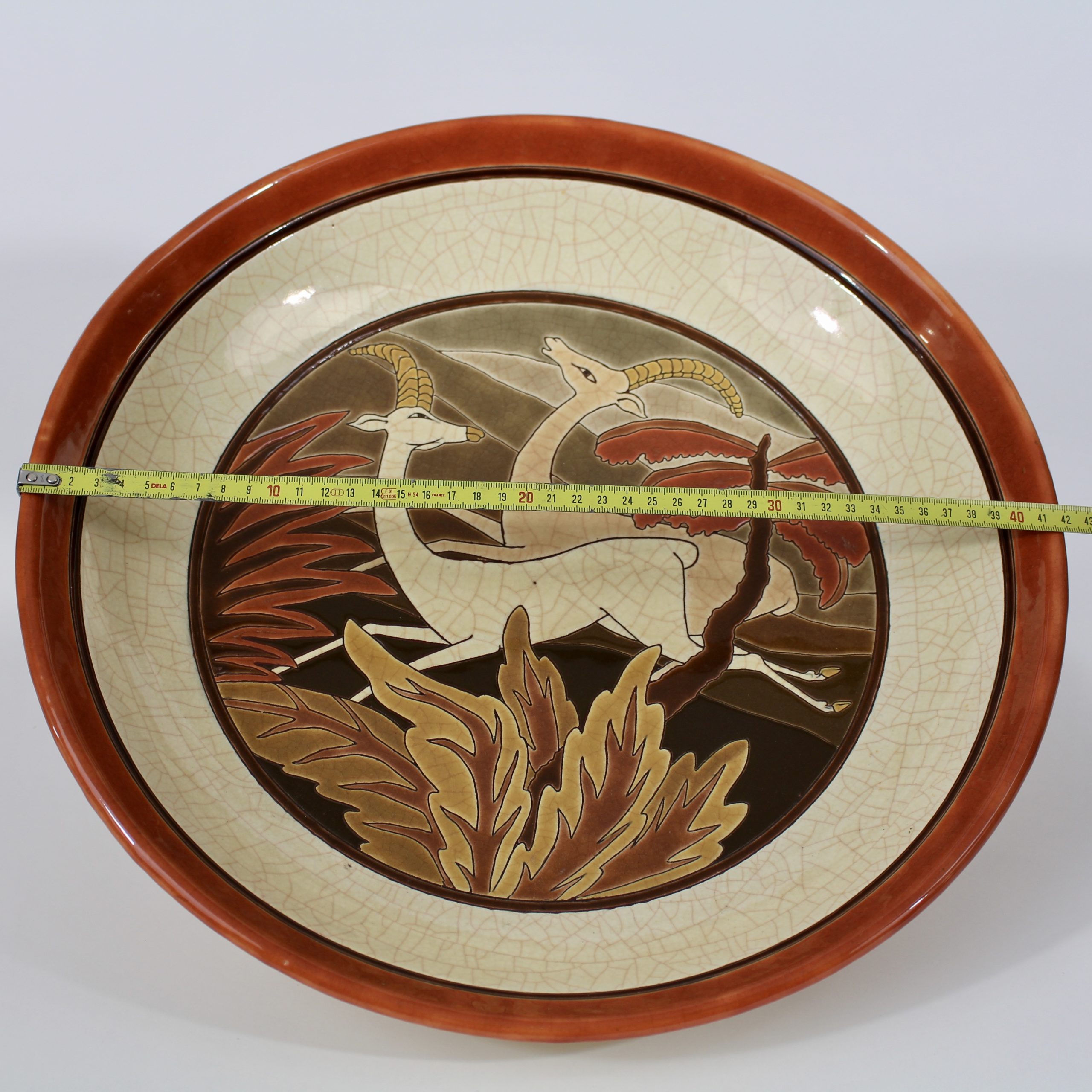 Grand plat rond en faïence craquelée et émaillée à décor stylisé de biches sur un fond floral.