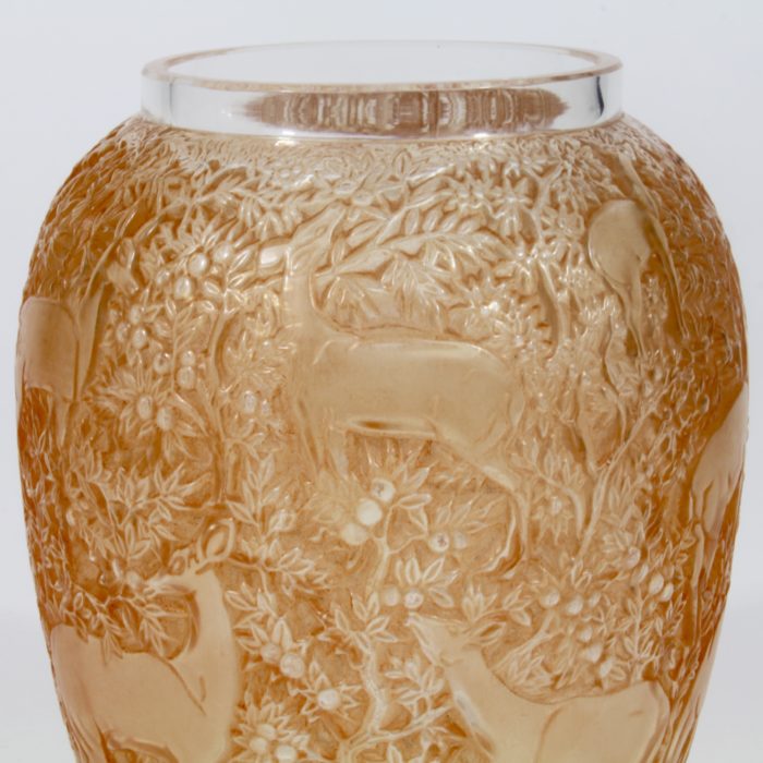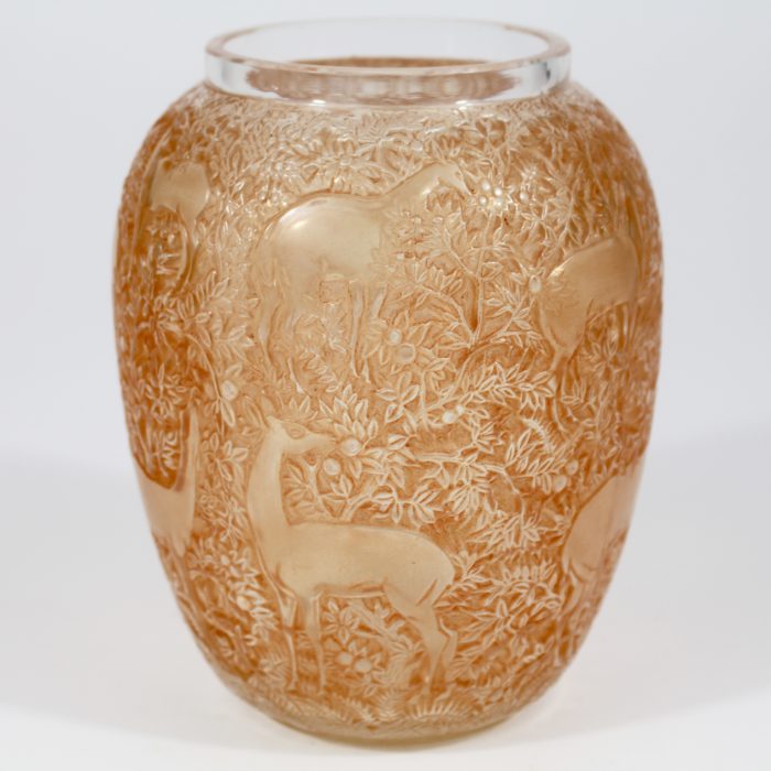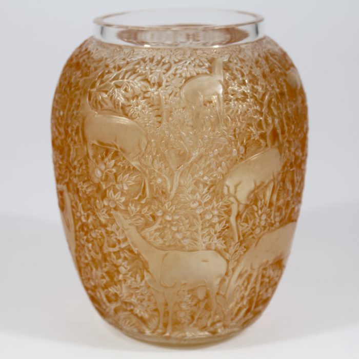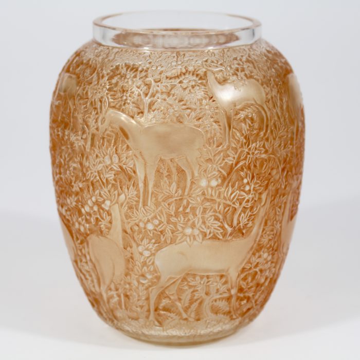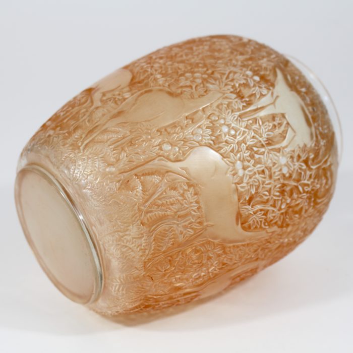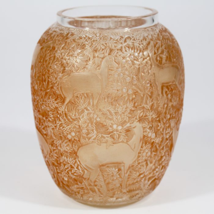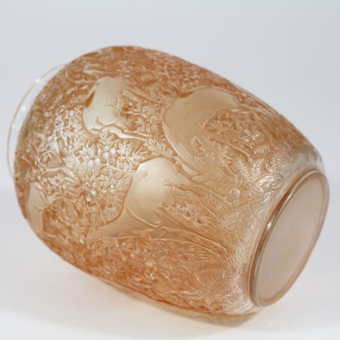 Vase en verre à décor tournant de biches dans une végétation luxuriante.