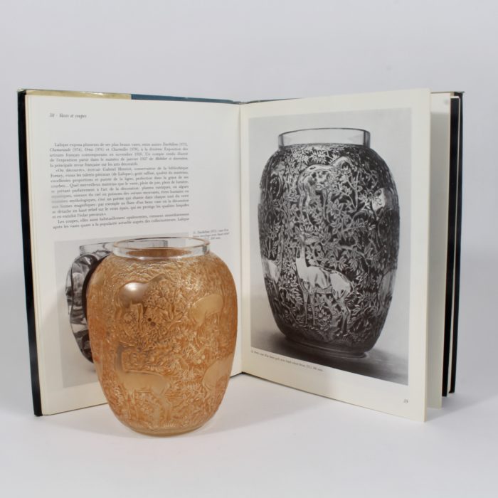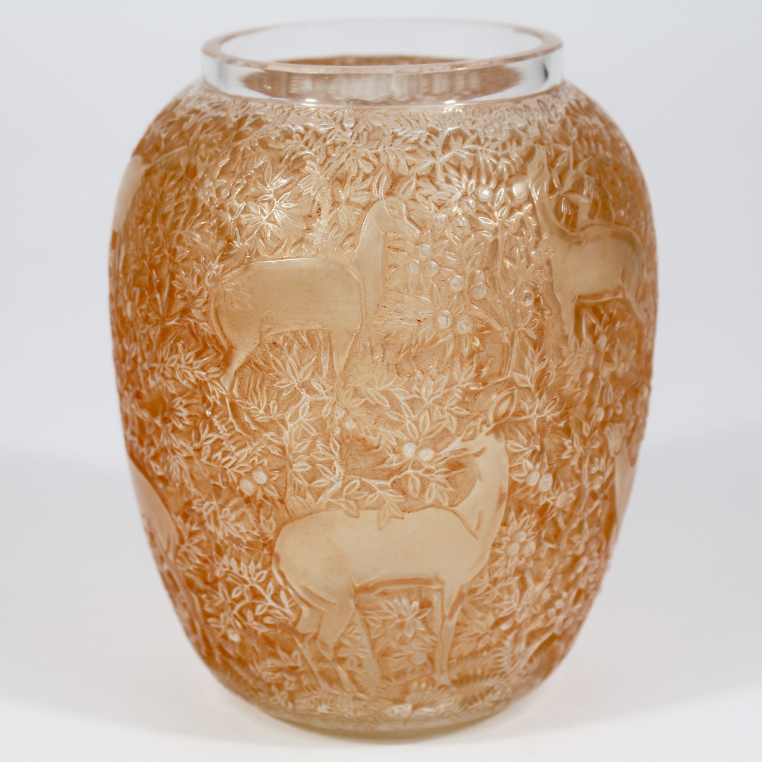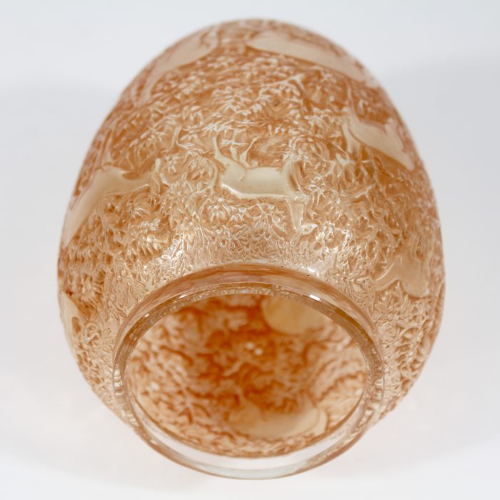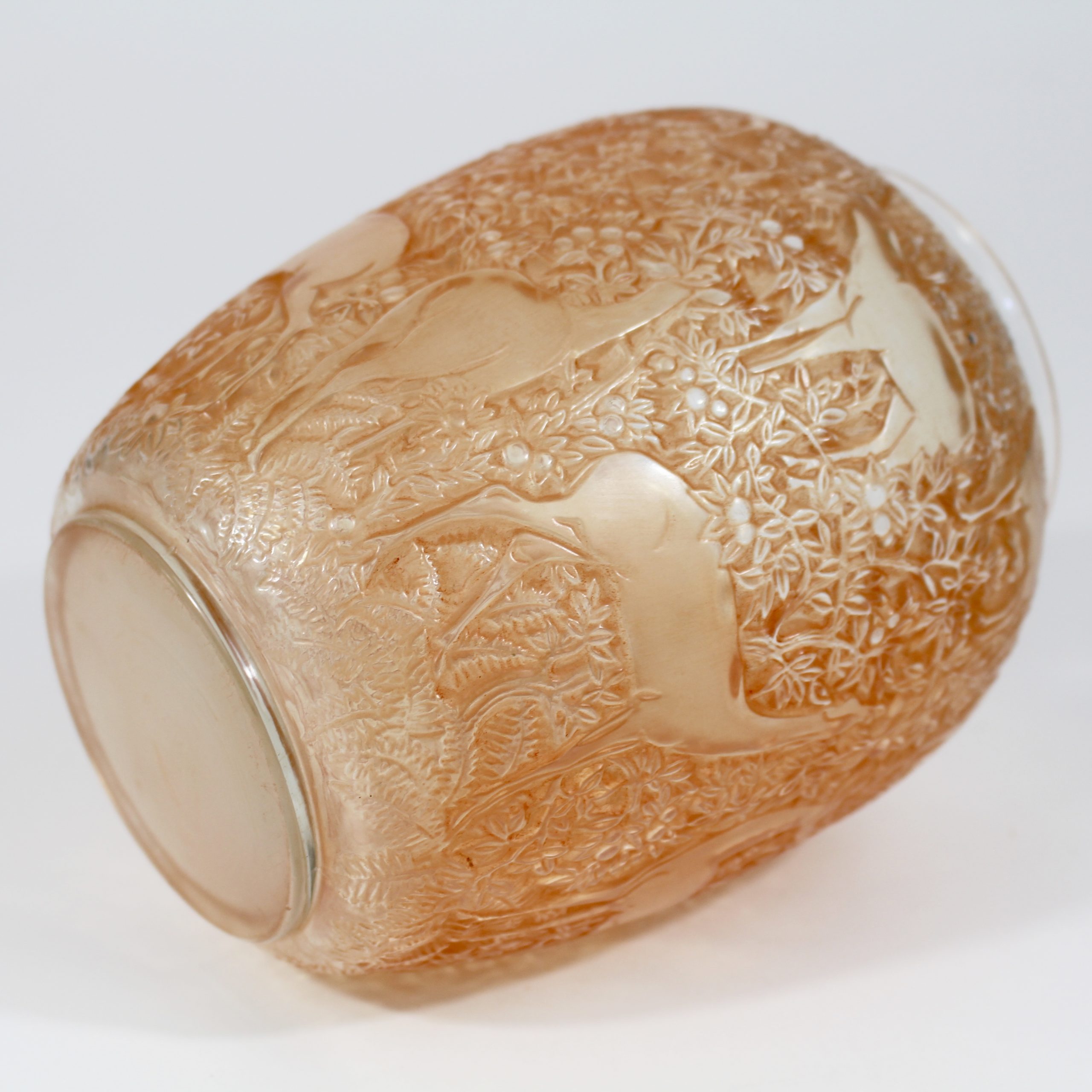 Vase en verre à décor tournant de biches dans une végétation luxuriante.
