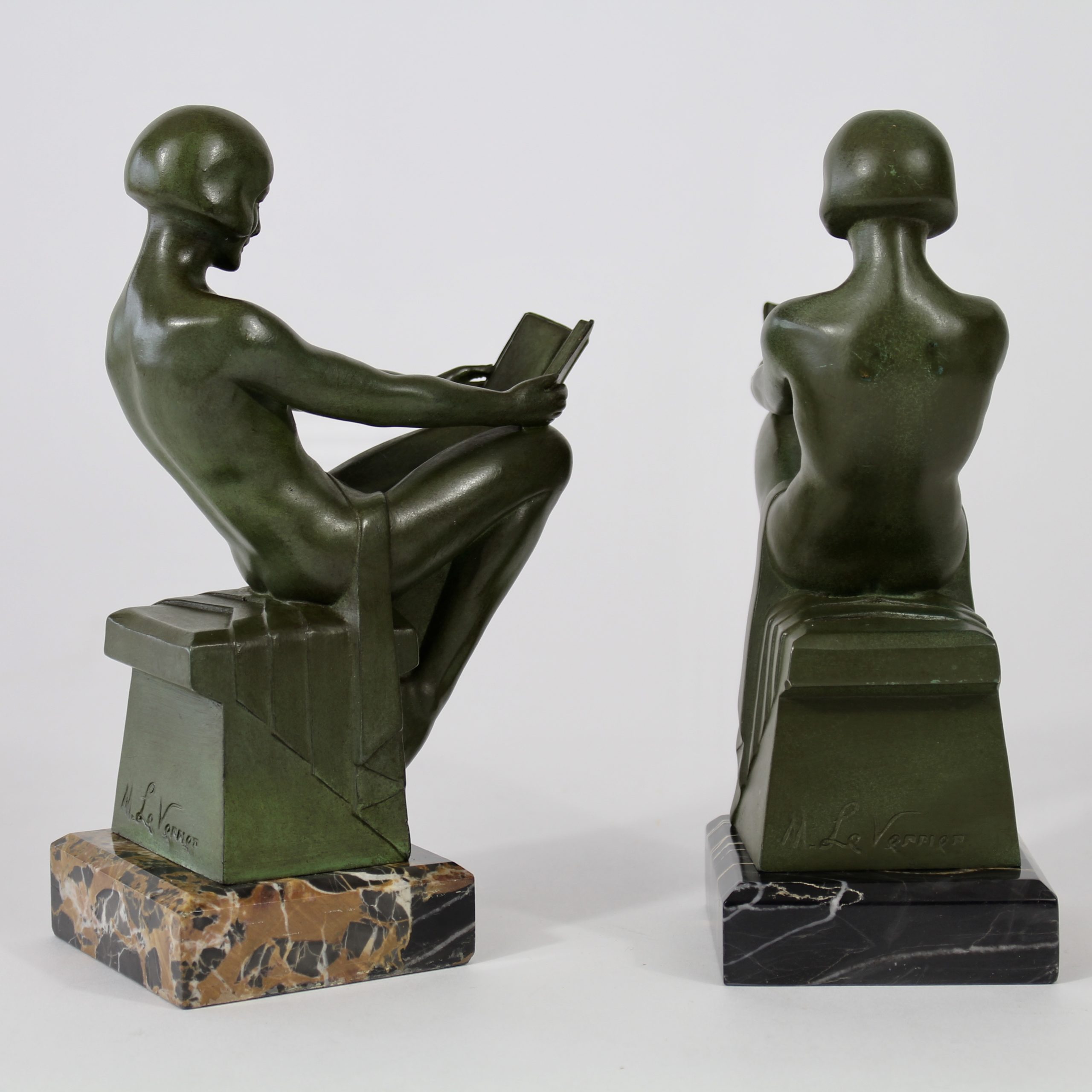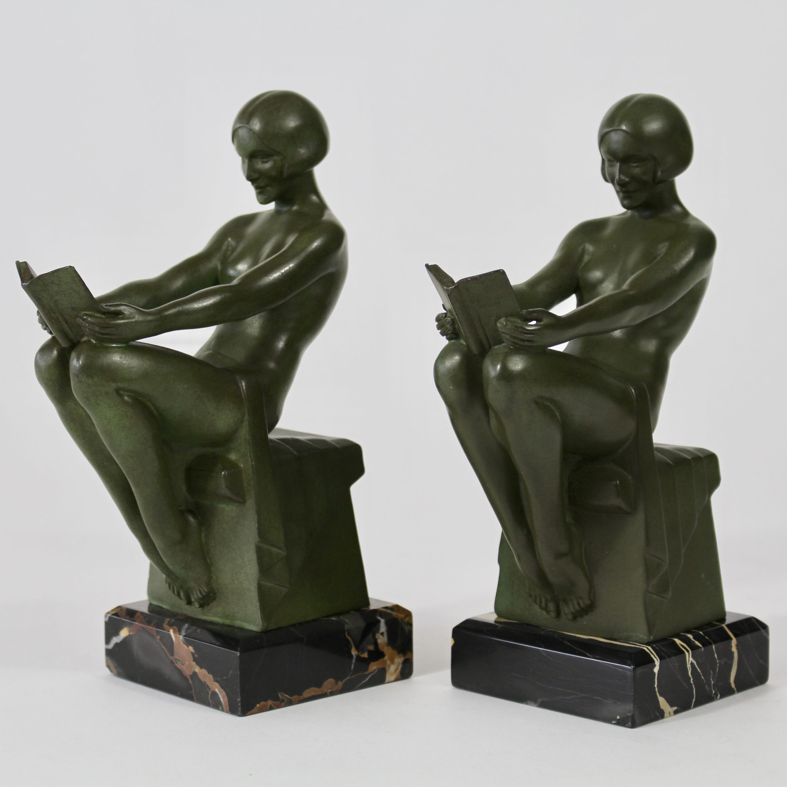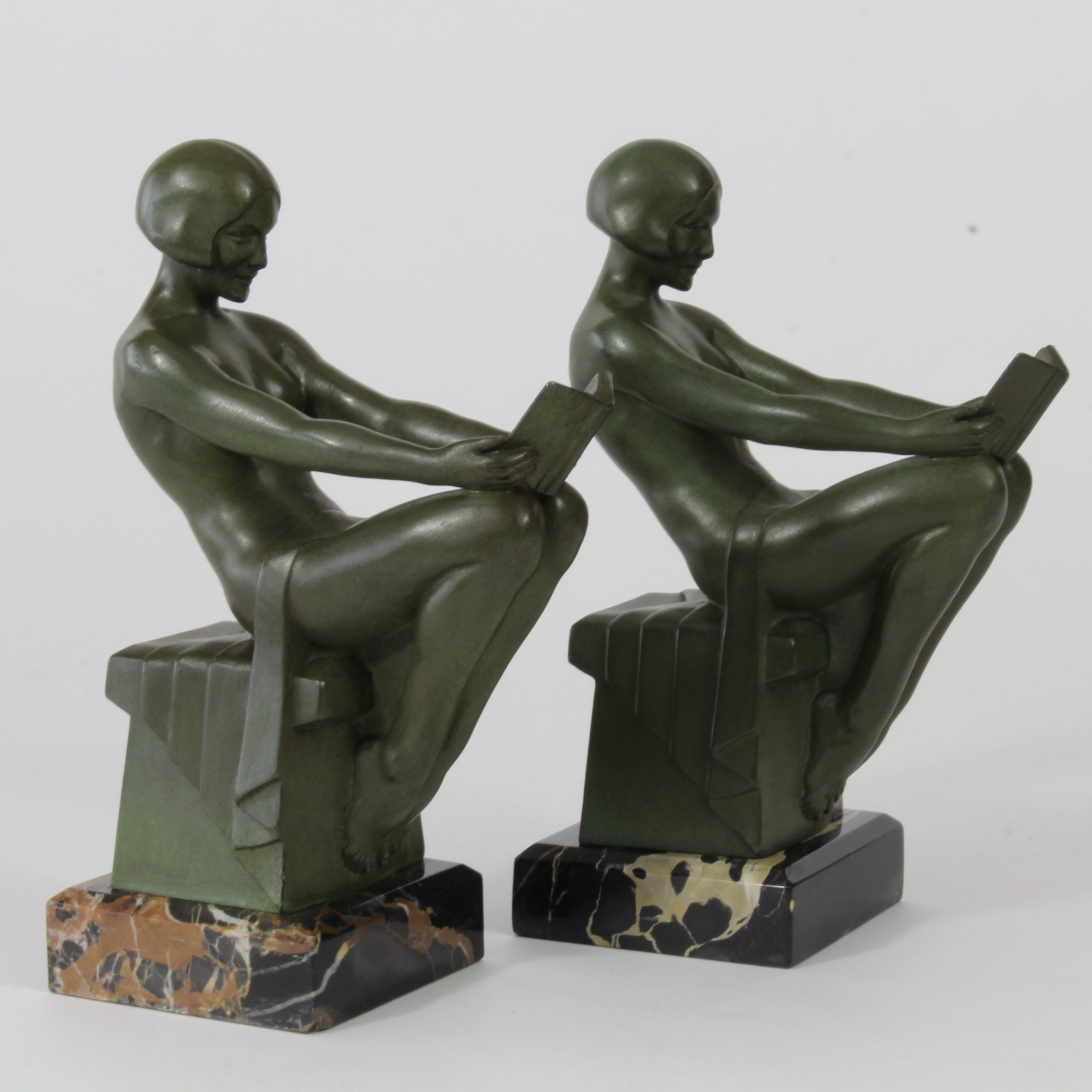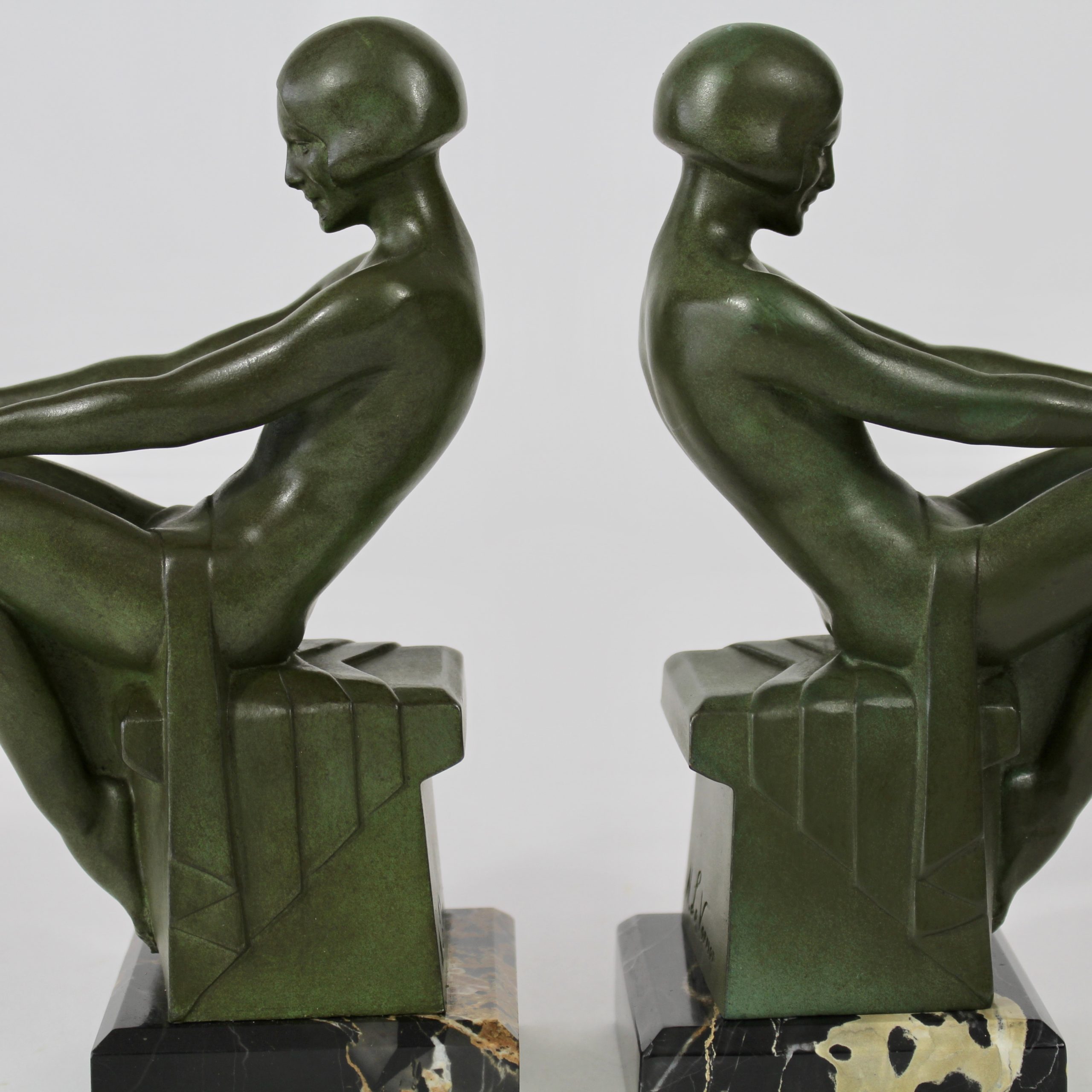 Belle et élégante paire de serre-livres en métal patiné par Max Le Verrier vers 1930.