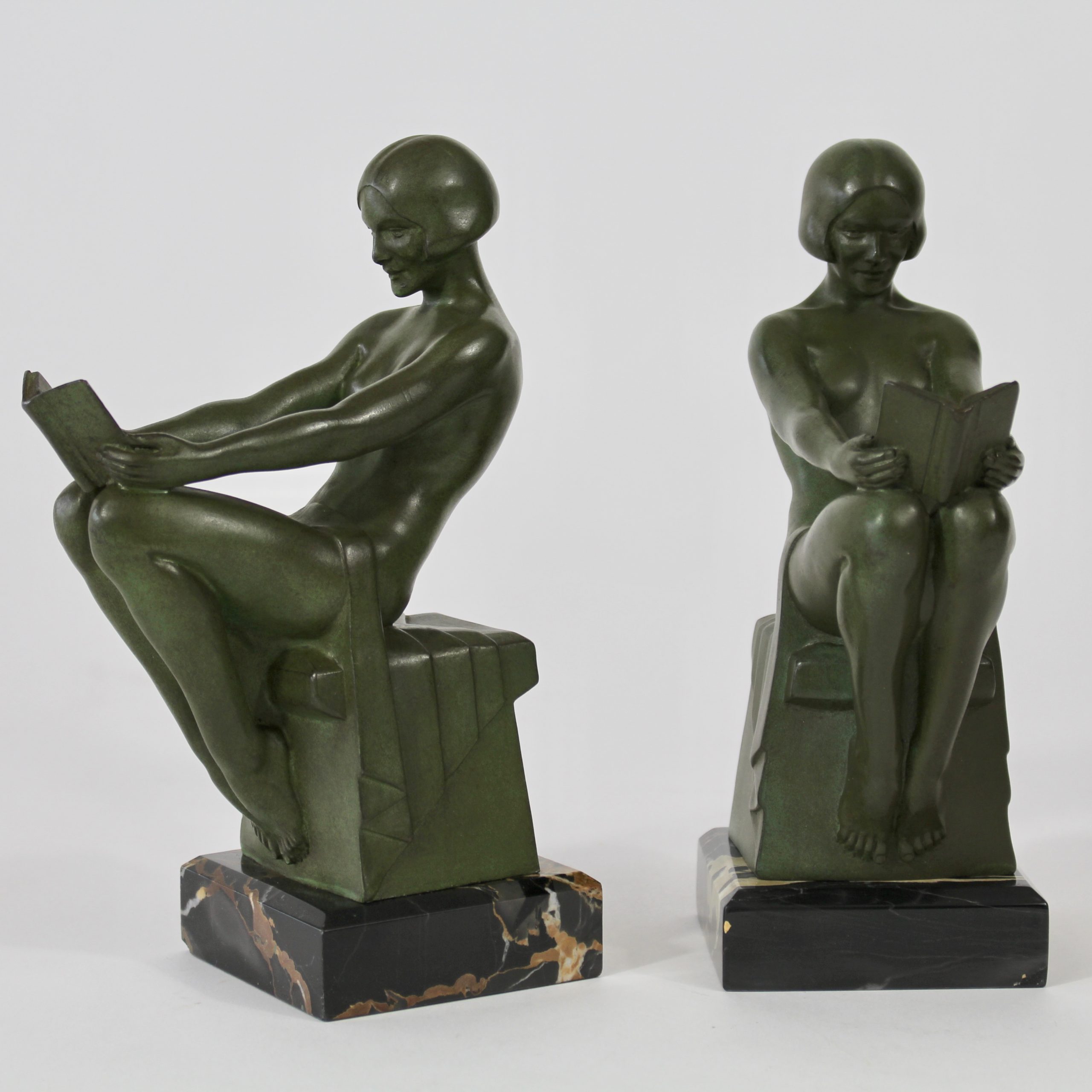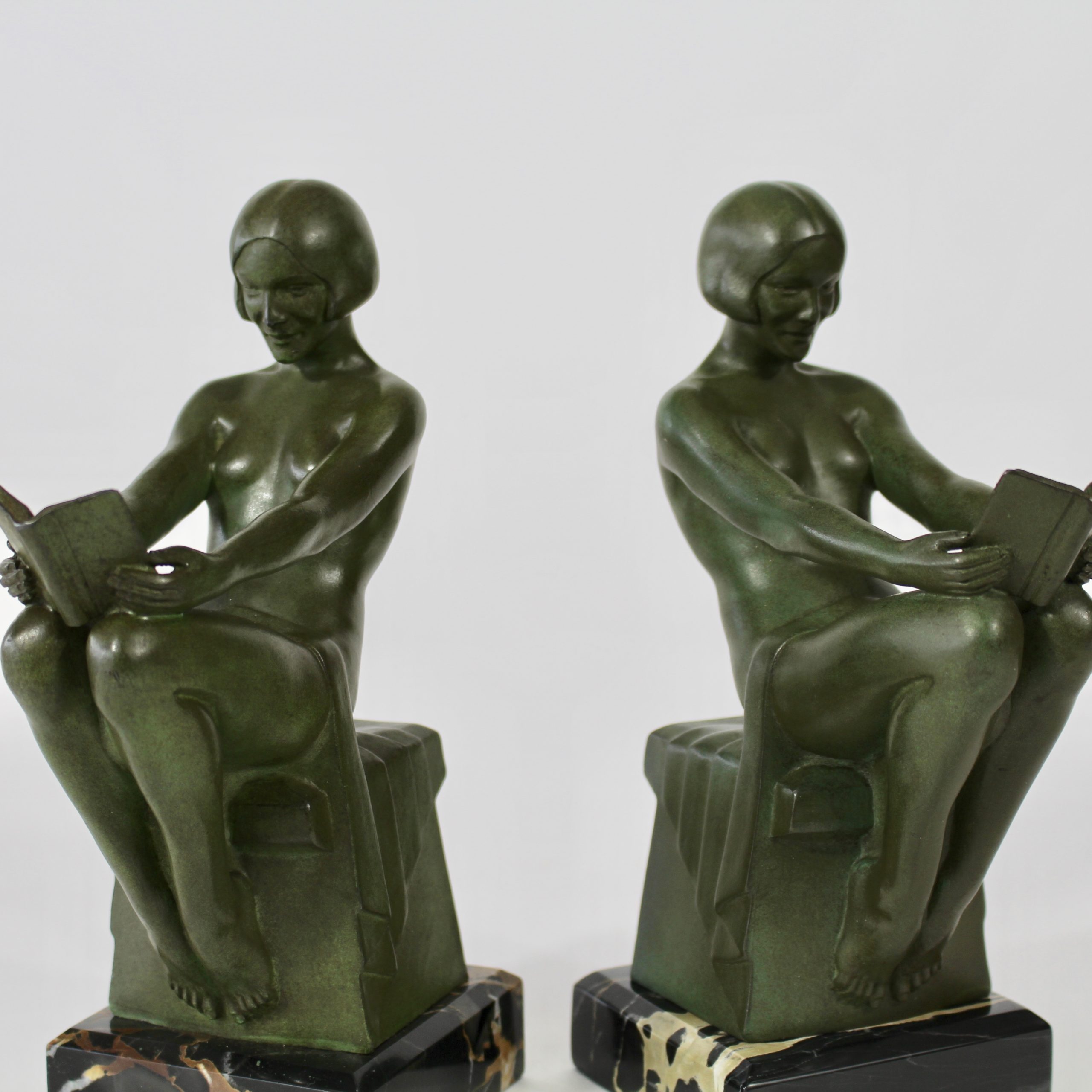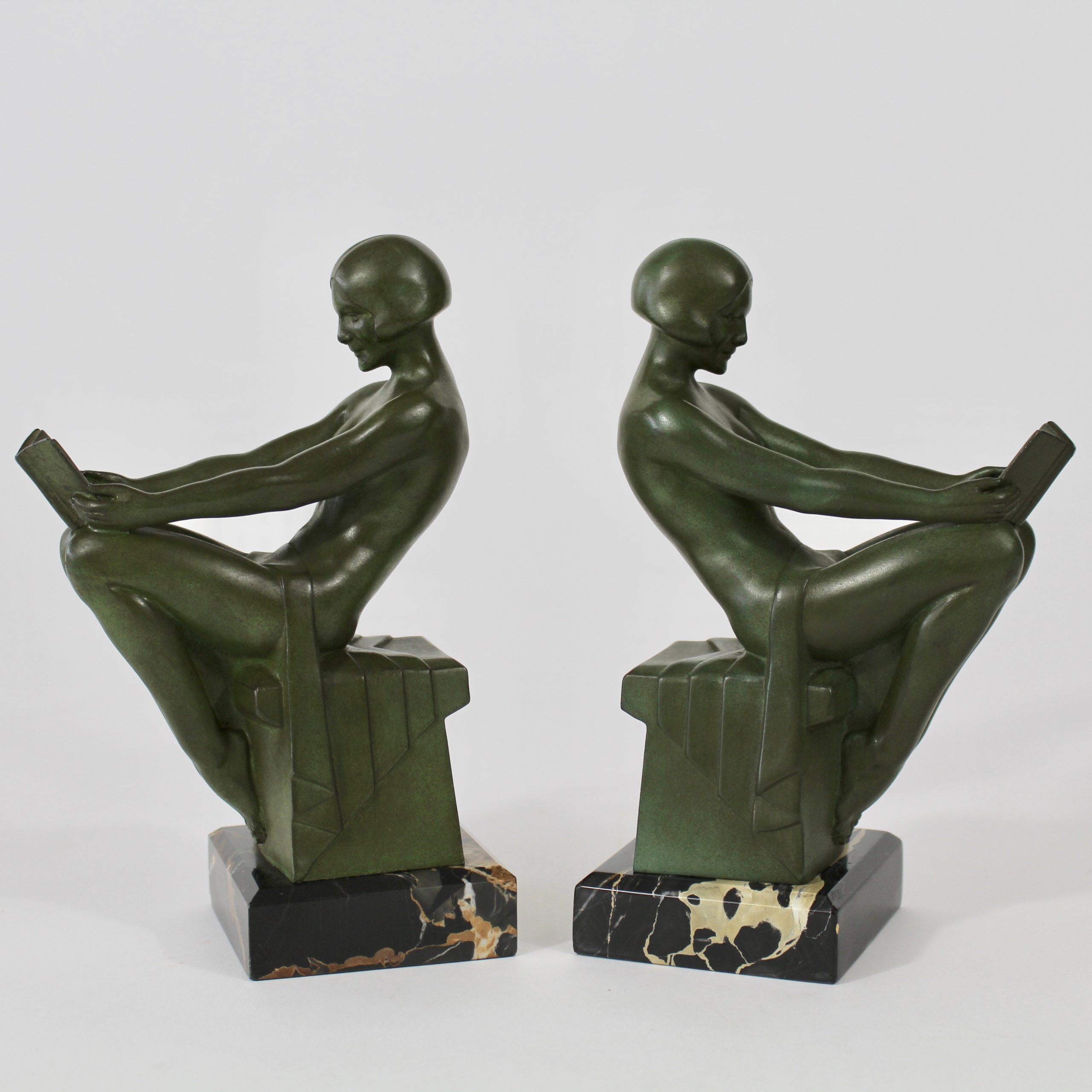 Belle et élégante paire de serre-livres en métal patiné par Max Le Verrier vers 1930.