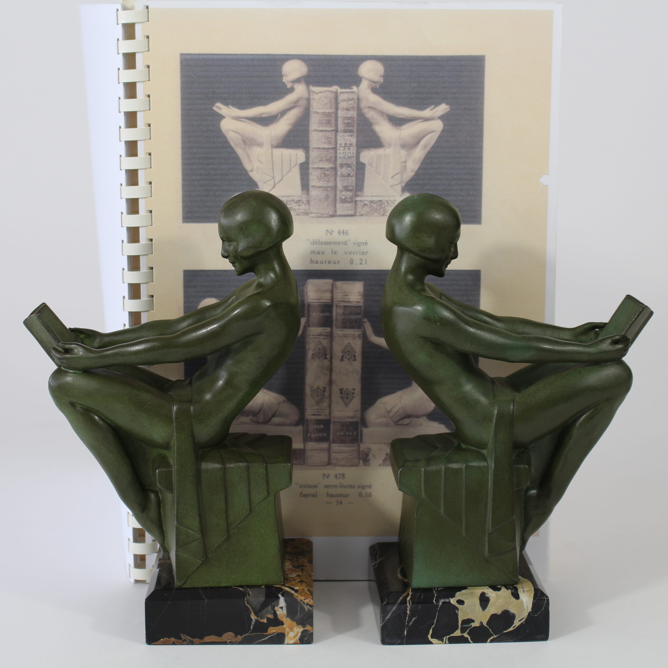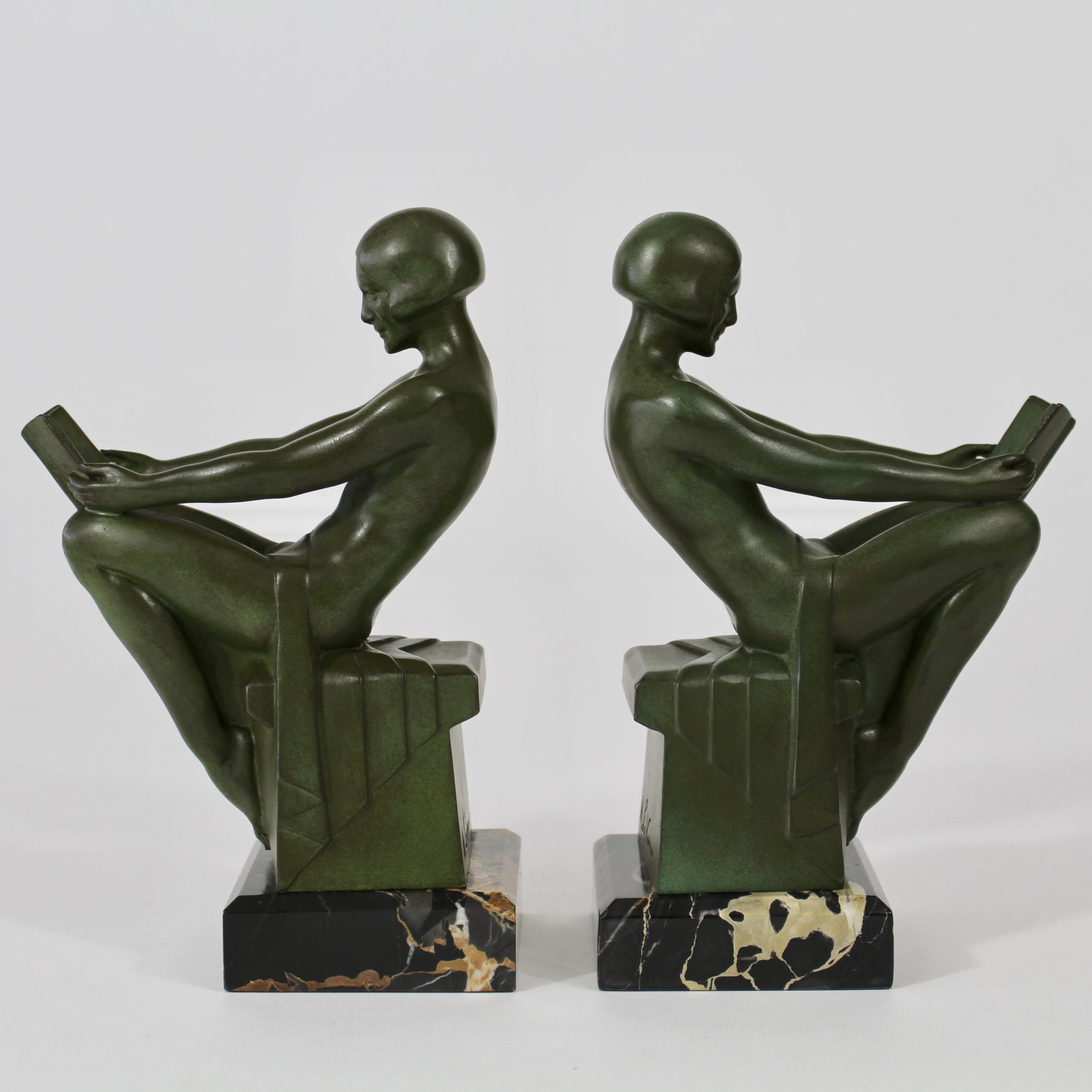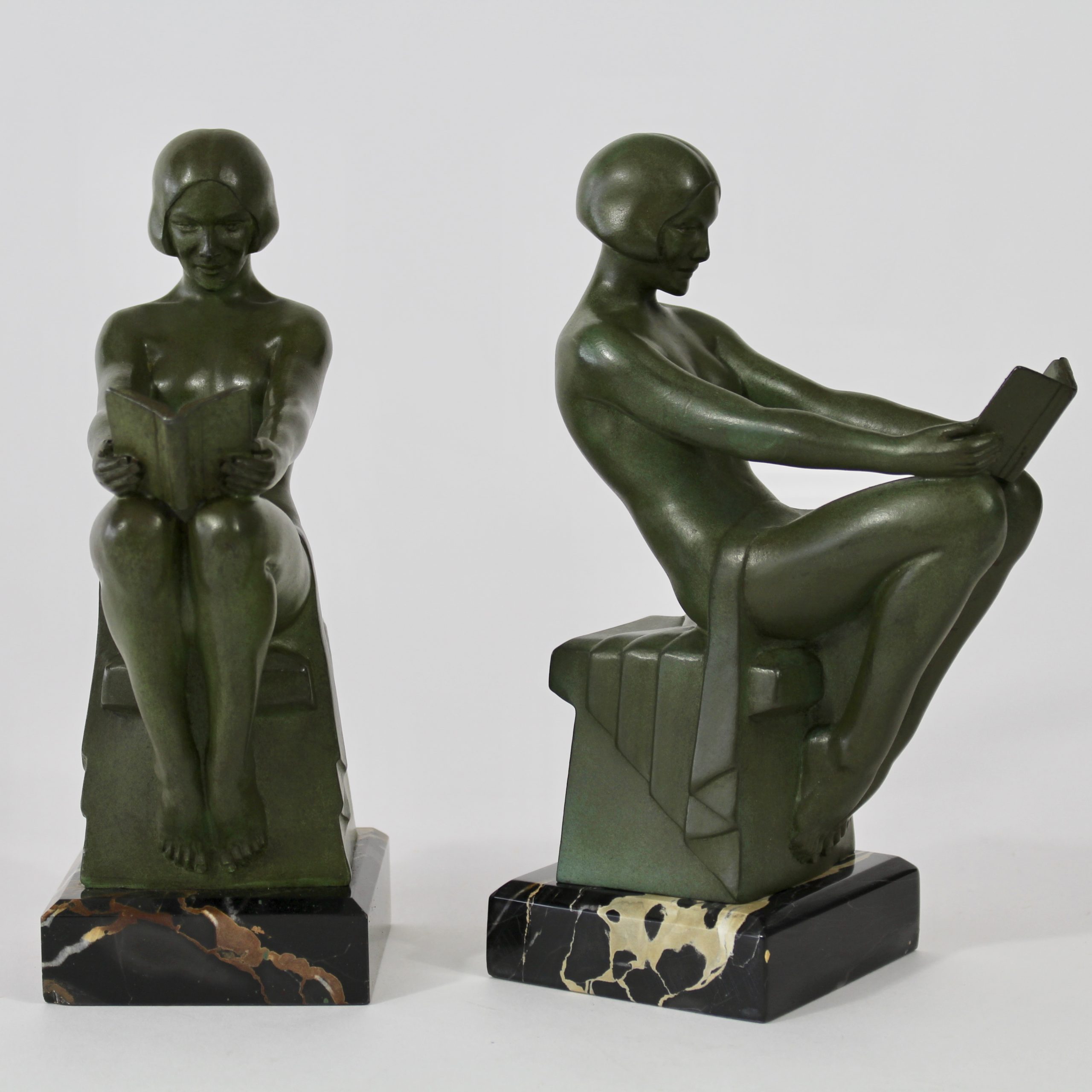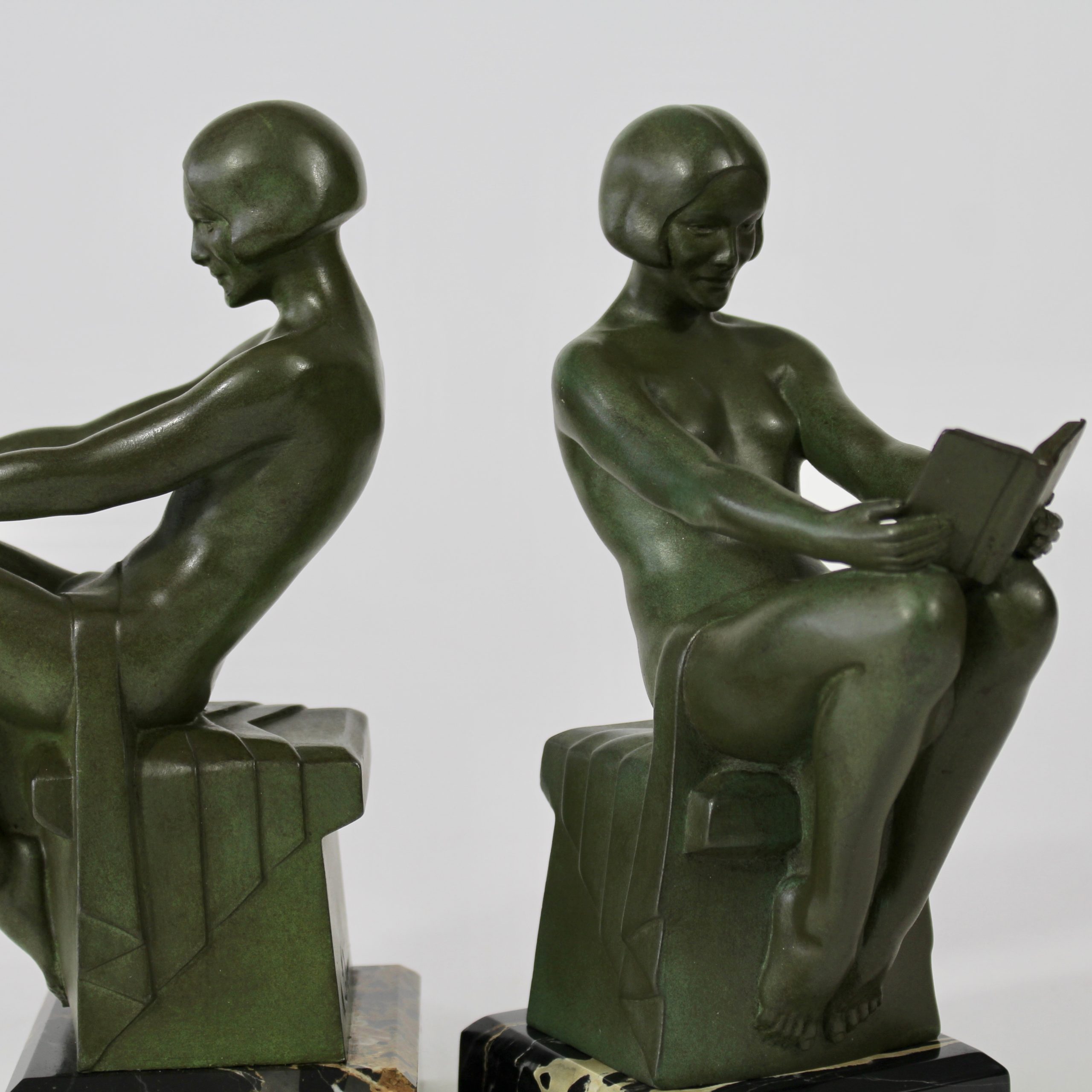 Belle et élégante paire de serre-livres en métal patiné par Max Le Verrier vers 1930.