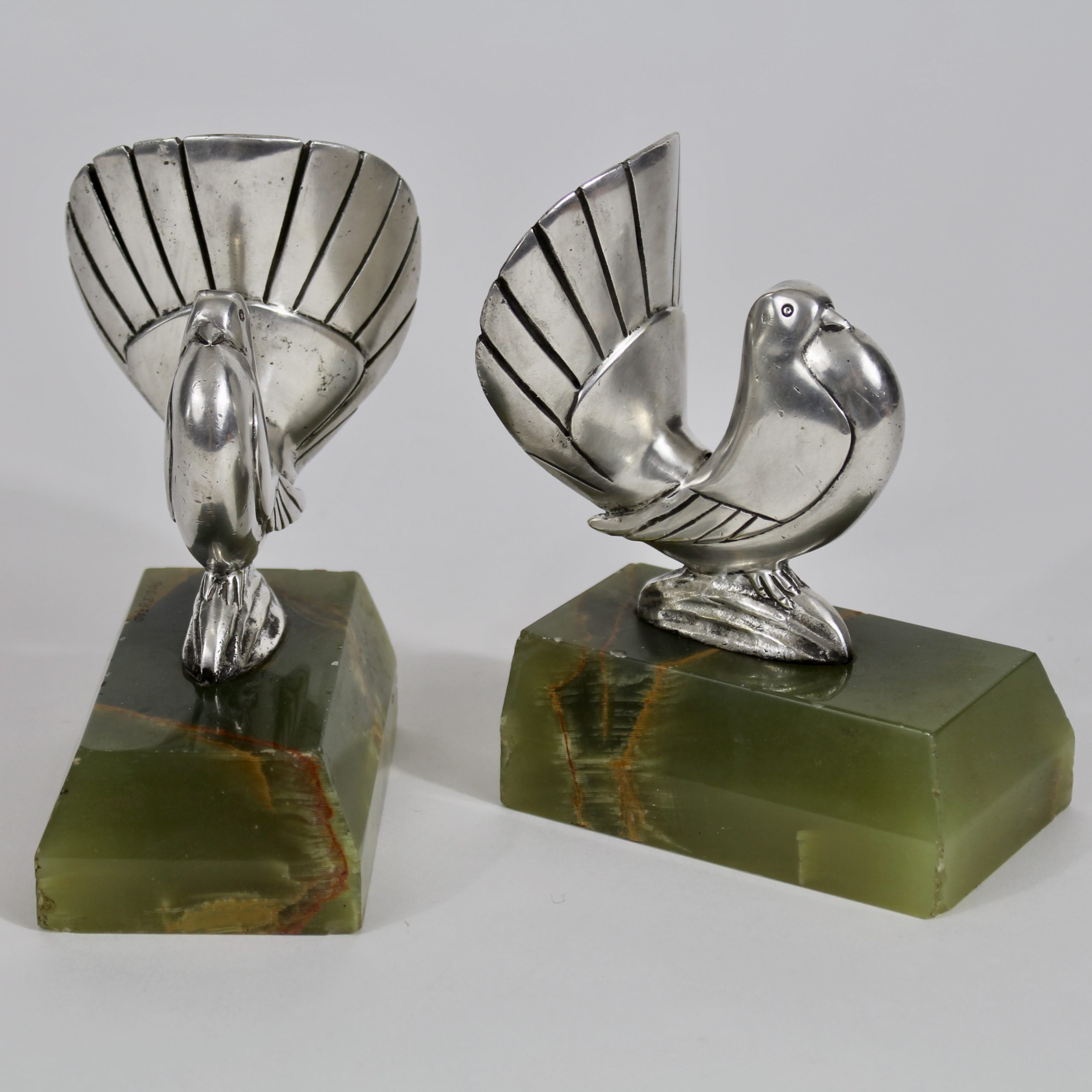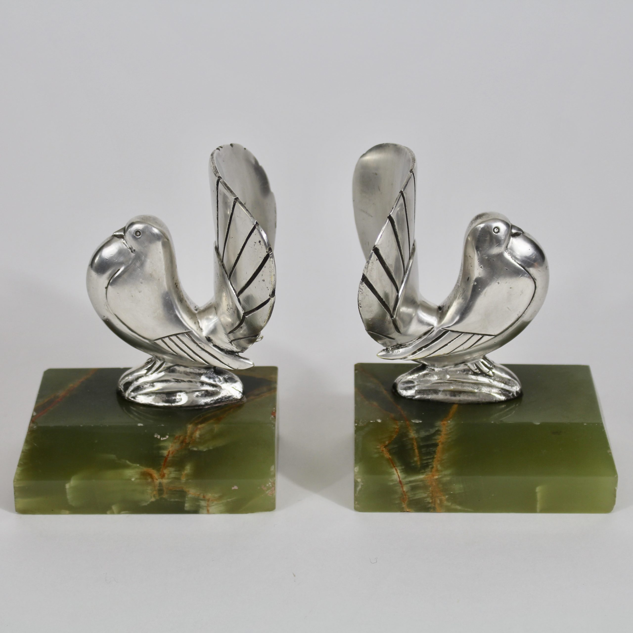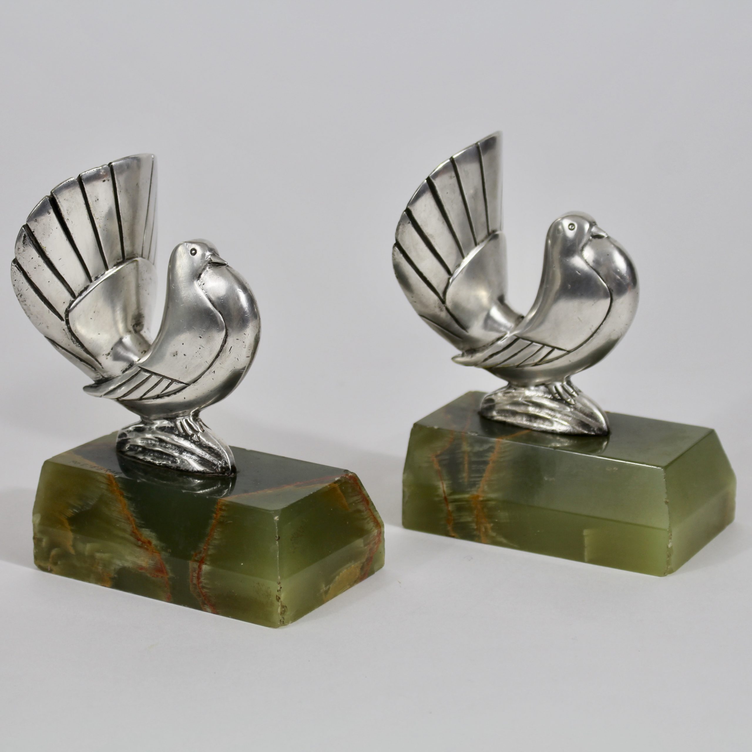 Ils représentent deux colombes stylisées en bronze argenté qui reposent sur des bases en onyx vert.