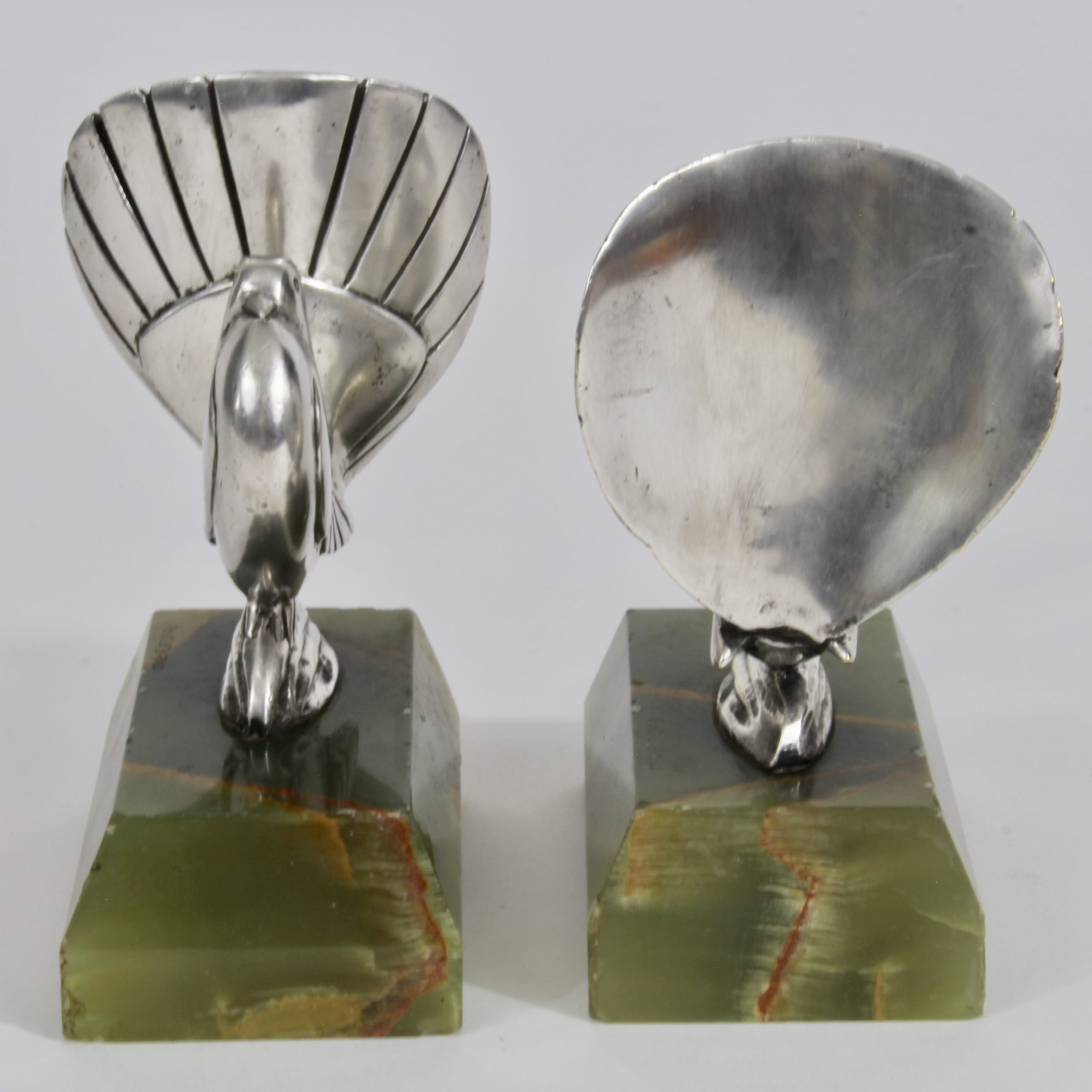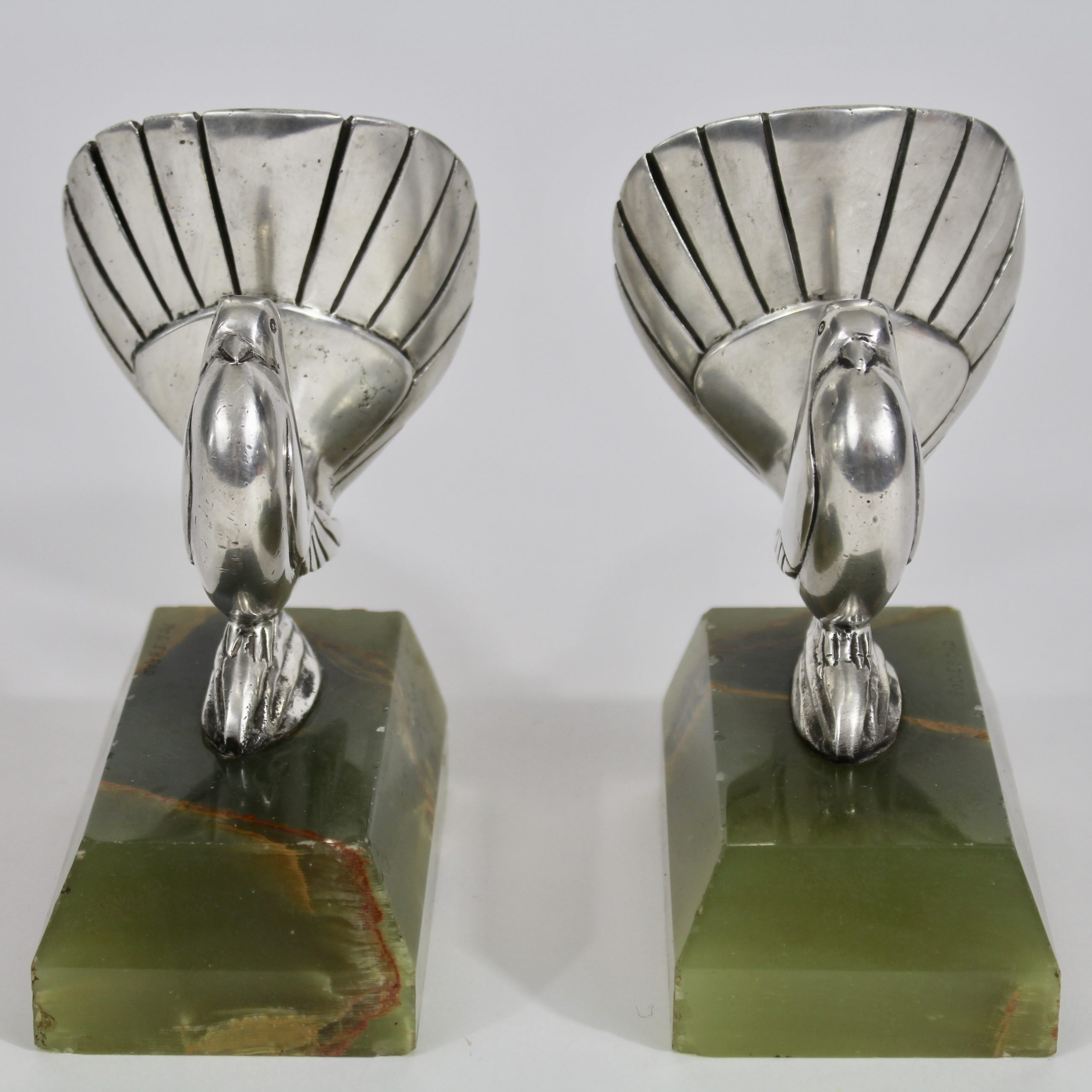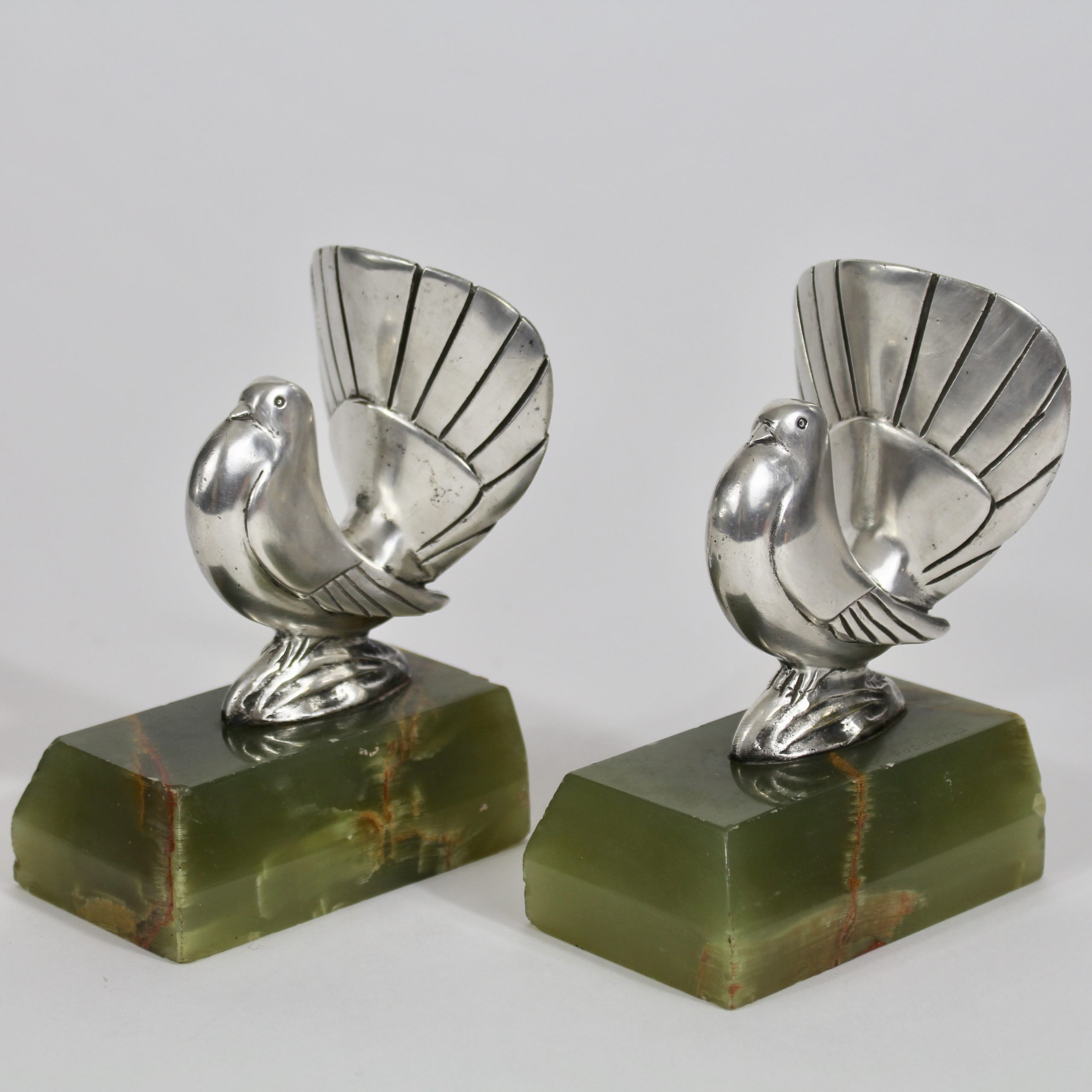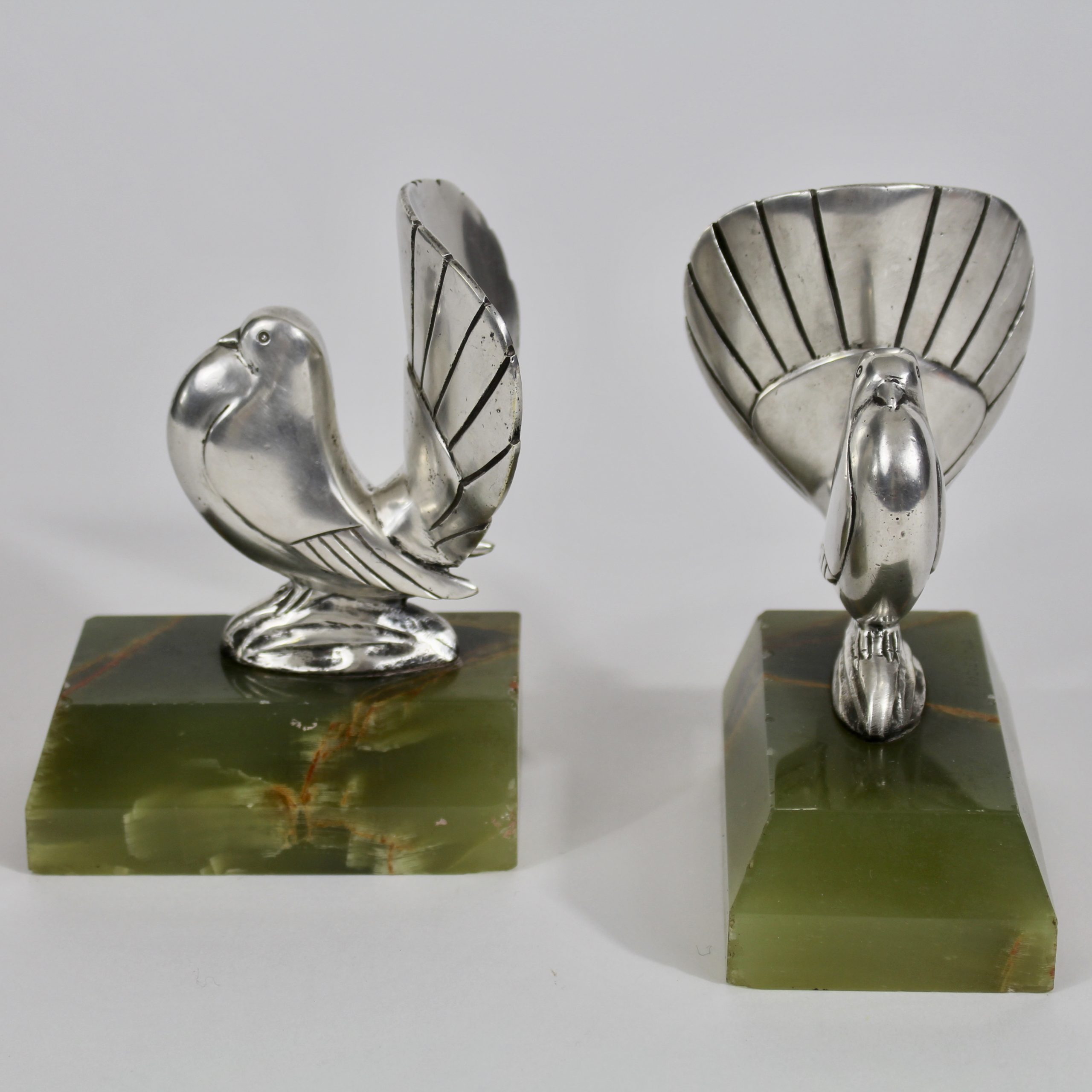 Ils représentent deux colombes stylisées en bronze argenté qui reposent sur des bases en onyx vert.