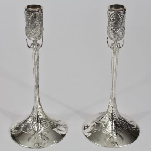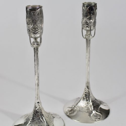 Très rare paire de bougeoirs en métal argenté d'époque Art Nouveau par Gallia. Modèle dessiné par Emile Gallé, bougeoirs à décor de plantes et d'épis de blé. Poinçon d'orfèvre Gallia sous chaque, numérotés 4367. Haut : 25 cm Modèle très difficile à trouver, en bon état ( petites marques d'usures dues à son ancienneté ). -