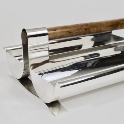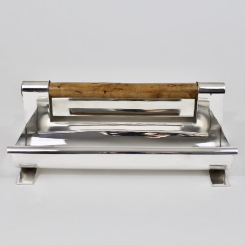 Très rare et important plateau du service " Etchea " par Jean Puiforcat. Modèle " Etchea " dessiné par Jean Puiforcat en 1928. Plateau en ébène verni orné de fines cannelures verticales,deux anses en métal argenté surmontées de trois boules. Poinçon EP pour Puiforcat et marque Puiforcat France sous une anse. Ce plateau est une réedition du modèle d'origine édité entre 1986 et 1990 par la Maison Puiforcat. Long : 71 cm Larg : 40 cm Modèle toujours commercialisé chez Puiforcat, le plateau d'un modèle différent de celui ci. Spectaculaire plateau, difficile à trouver, en excellent état. -