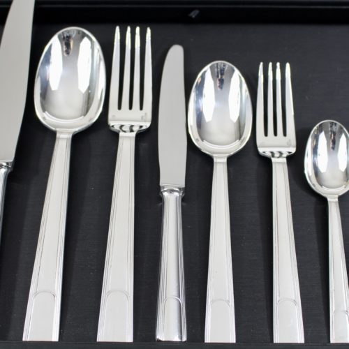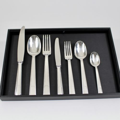 Rare et élégante ménagère en métal argenté par Christofle vers 1937. Modèle " Gabon " crée en 1937 par Christian Fjerdingstad pour l'Exposition Internationale de Paris en 1937, présenté au Pavillon Christofle. Elle comprend : 8 Couteaux de table 8 Fourchettes de table 8 Cuillères de table 8 Couteaux à entremet 8 Fourchettes à entremet 8 Cuillères à entremet 8 Cuillères à café 5 Pièces de service 61 Pièces Toutes les pièces portent le poinçon d'orfèvre Christofle. Vendue dans des pochettes en suédine Christofle. Ce modèle est emblématique de la production Christofle de cette époque, cette série est très recherchée. Très bel état ( infimes marques dues à son utilisation et son ancienneté ) -