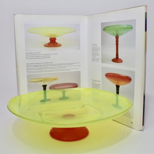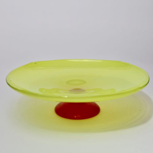 Rare et élégante coupe en verre par Charles Schneider vers 1920. Vasque en verre poudré vert absinthe, bords étirés à chaud et pincé quatre fois. Jambe et pied orange appliqués à chaud. Signée Schneider autour de la base. Diam : 28,5 cm Haut : 8 cm Très jolie coupe aux couleurs franches et contrastées, en excellent état. -