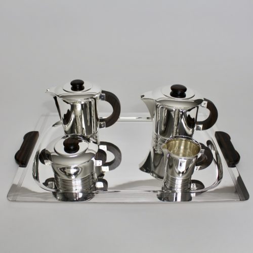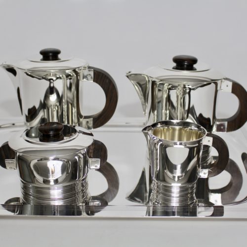 Important et élégant service à thé-café en métal argenté par Ercuis vers 1930. Modèle " Malacca " composé de cinq pièces : 1 Plateau rectangulaire d'origine 54 x 36 cm 1 Cafetière haut 16 cm long 17 cm 1 Théière 14 cm 18 cm 1 Pot à lait 8 cm 11 cm 1 Sucrier 8 cm 14 cm Prises et anses en bois de macassar. Toutes les pièces portent le poinçon d'orfèvre Christofle. Beau service d'époque Art Déco en excellent état, belle brillance ( infimes marques dues à son utilisation et son ancienneté ). -
