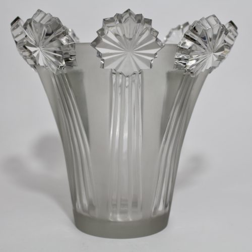 Très important et rare vase en cristal par Lalique France vers 1950. Modèle " Sirius " ou " Comètes " crée par Marc Lalique en 1950. Vase ou seau à champagne en cristal clair et satiné à décor de huit comètes. Signature sablée Lalique France sous la base. Haut : 28 cm Diam : 30 cm Très beau vase d'une grande complexité de fabrication. Excellent état. -