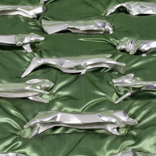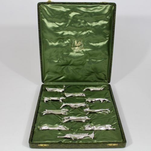 Bel ensemble de porte-couteaux animaliers en métal argenté par Christofle vers 1930. Dessin communément attribué au sculpteur Suisse Gérard Sandoz. Il comprend 12 animaux , tous différents, vendus dans leur boîte d'origine siglé Gallia en très bel état. Dimensions : 32 x 28 x 4 cm 1 Paon, 1 Cygne, 1 Colombe, 1 Ours,1 Lièvre, 1 Pélican 1 Lion, 1 Chat, 1 Porc, 1 Lévrier, 1 Chien couché, 1 Poisson. Chaque pièce faisant entre 8 et 10 cm de long. Toutes les pièces portent le poinçon d'orfèvre Christofle ainsi que la marque Gallia. L'ensemble est dans un très bel état de conservation, ils ont été très peu utilisés. -