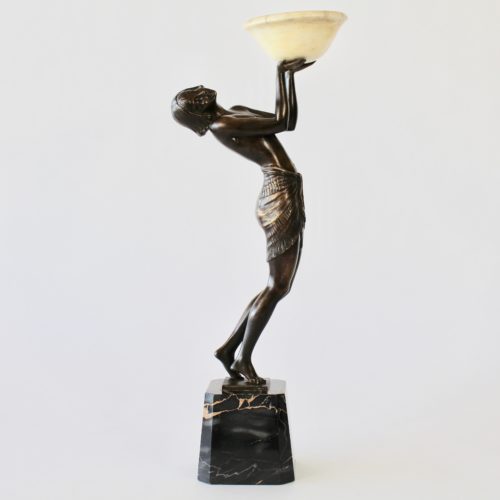 Rare et élégante lampe Art Déco en métal patiné par Max Le Verrier. Modèle " Lueur " crée par Max Le Verrier en 1928. Elle figure une jeune femme nue tenant au bout de ses bras tendus une boule éclairante en verre craquelé. Patine verte, socle rond en marbre Portor. Modèle édité par Max Le Verrier. Fonte d'édition ancienne. Signée Le Verrier autour de la base. Haut : 40 cm Belle lampe en excellent état. -