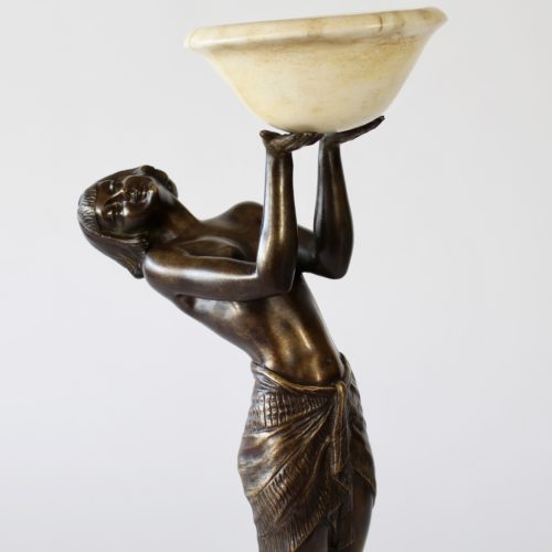 Belle et rare sculpture en bronze par Pierre Laurel vers 1930. Elle représente une jeune orientale tenant une coupelle sur ses mains. Patine bronze, coupe en albâtre, socle en marbre Portor. Fonte d'édition ancienne. Haut : 53 cm Signée Pierre Laurel et Marcel Guillemard éditeur, numéroté 35. Excellent état.