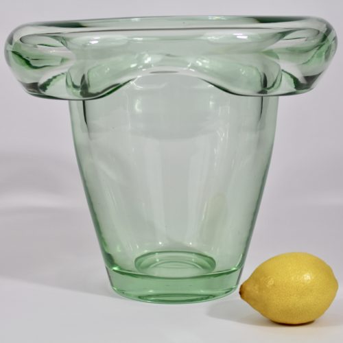 Important vase en cristal par Daum Nancy France vers 1950. Spectaculaire vase en cristal teinté vert à col retourné. Signé Daum Nancy France. Haut : 24 cm Diam : 30 cm Rare modèle de grande taille, très décoratif, en excellent état. -
