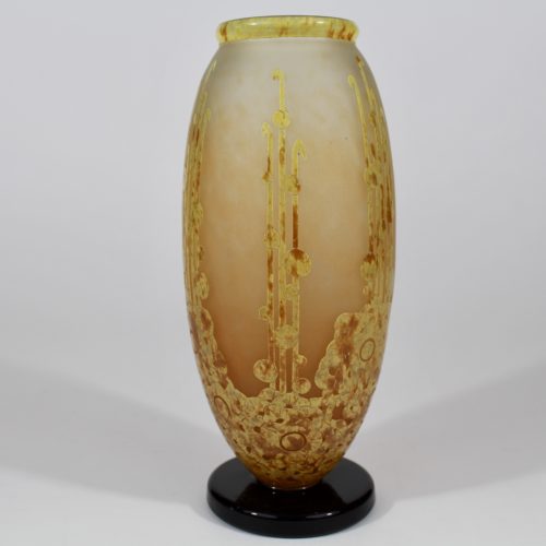 Très important et rare vase en verre par Charles Schneider vers 1927. Vase modèle " Rustique " de forme obus, en épais verre bullé ambré. Applications de lignes et de spirales appliquées à chaud. Signé Schneider au jet de sable. Haut 34 cm Larg 23 cm Diam col 11 cm Spectaculaire et très beau vase en excellent état. -