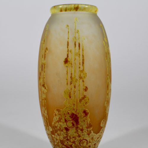 Très élégant vase en verre par Charder-Le Verre Français vers 1928. Modèle " Roses Trémières " en verre poudré blanc et orange, doublé de verre poudré orange. Motif dégagé à l'acide, pied rond en verre violet appliqué à chaud. Signé Charder- Le Verre Français autour de la base. Haut : 28 cm Beau vase stylisé aux couleurs chaudes. Excellent état. -